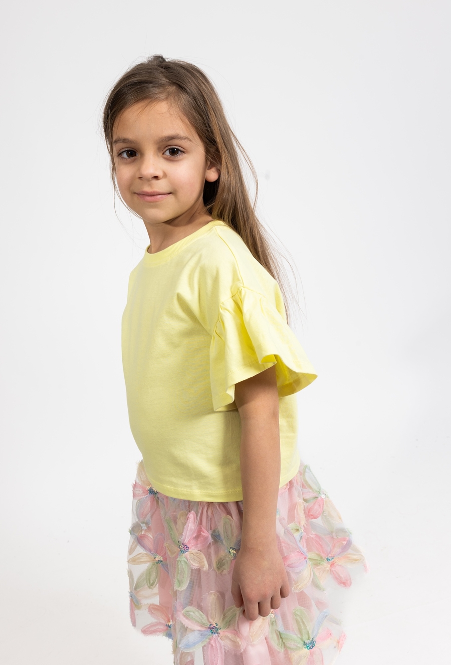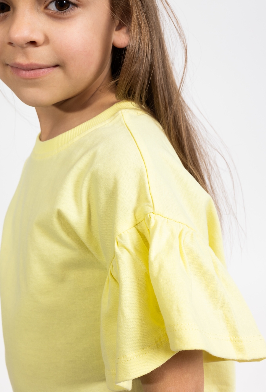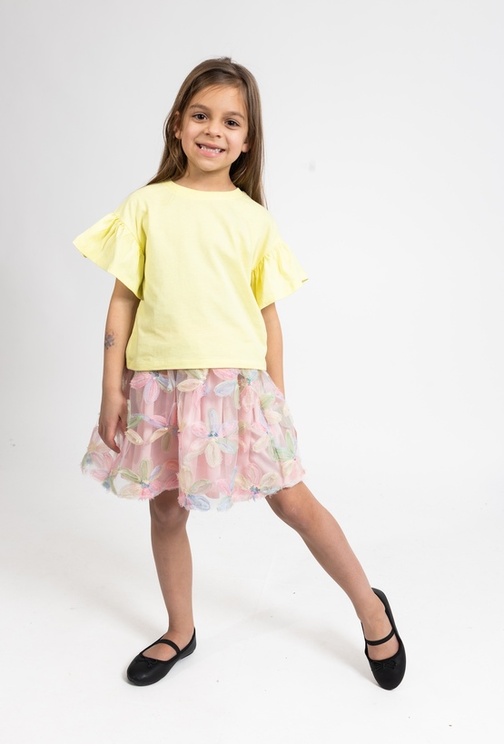 Ta wyjątkowa koszulka to propozycja dla dziewczynek, które cenią sobie modny wygląd i wygodę. Model wyróżnia się nowoczesnym, pudełkowym fasonem, który zapewnia pełną swobodę ruchów, a zarazem prezentuje się bardzo stylowo. Całość utrzymana jest w słonecznym, żółtym kolorze, który idealnie pasuje do letnich stylizacji. Cechą charakterystyczną tego modelu są szerokie rękawki, które dodają koszulce lekkości i oryginalnego charakteru. To idealna baza do codziennych strojów, która świetnie wygląda w zestawieniu z jeansami, szortami czy spódniczkami.