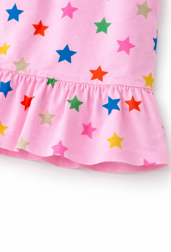 Różowa koszulka dla dziewczynki z uroczym nadrukiem w kolorowe gwiazdki to lekka propozycja na ciepłe dni. Wykonana w 100% z bawełny, jest miękka, przewiewna i delikatna dla skóry. Print all over jest przyjemny w dotyku, a dół wykończony falbanką z materiału głównego dodaje całości dziewczęcego uroku. Świetnie pasuje do legginsów, szortów i spódniczek.