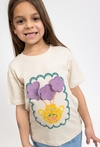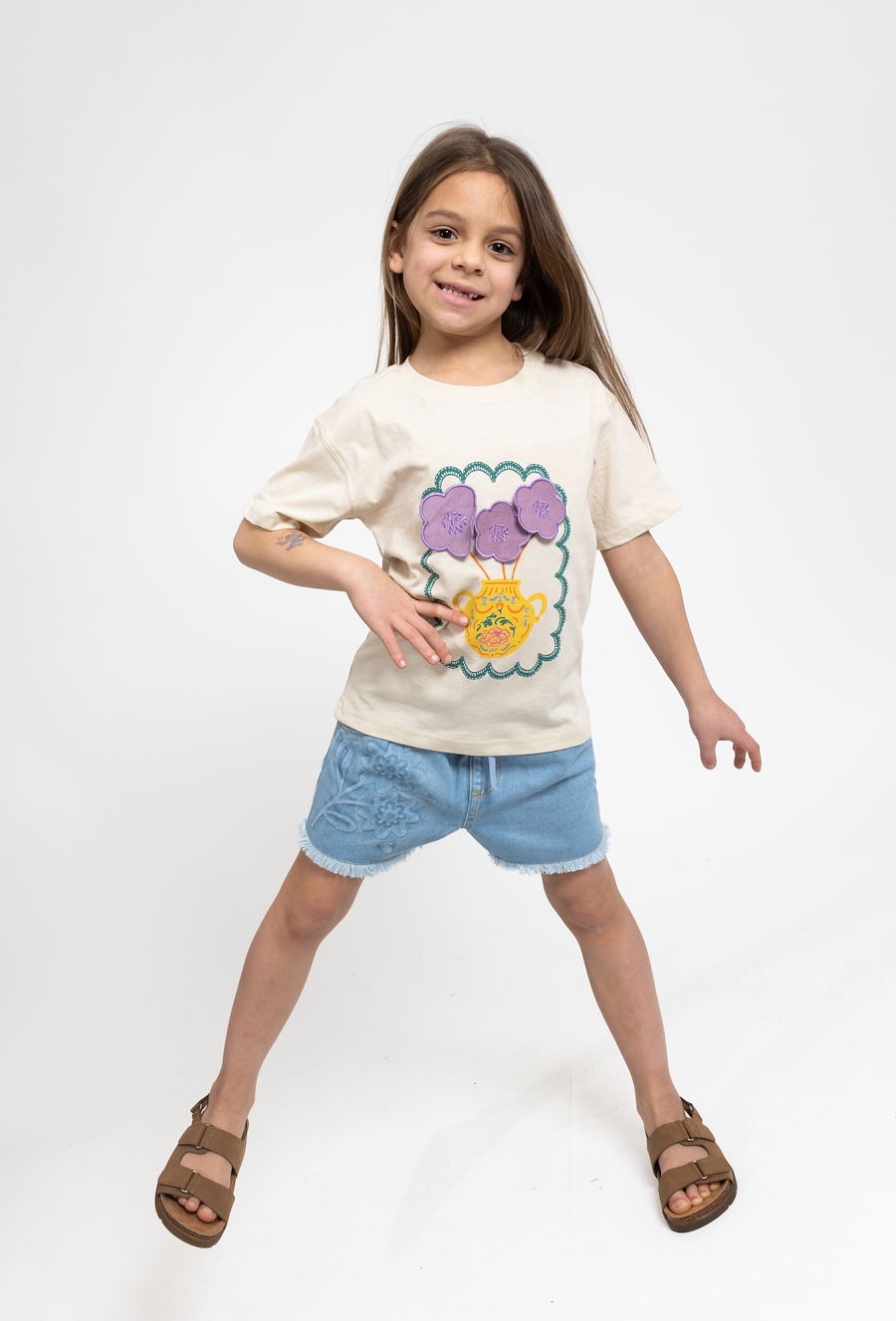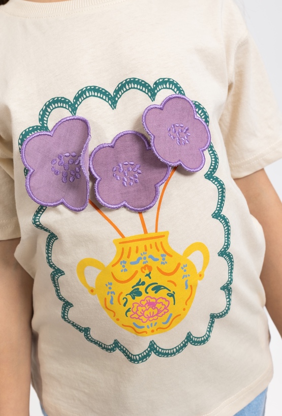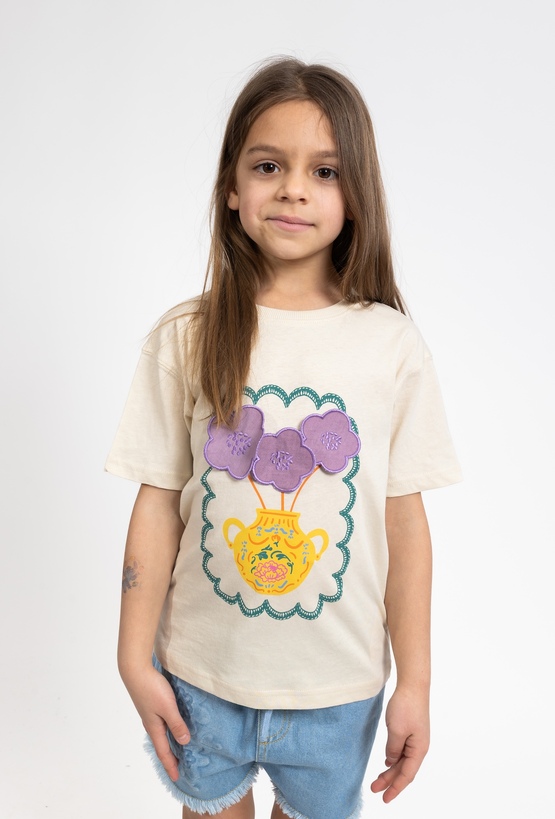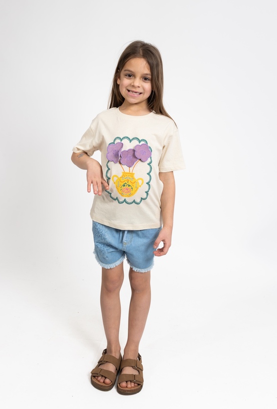 Komfort na co dzień w dziewczęcym stylu. Kremowa koszulka 51015 w fasonie pudełkowym dobrze układa się na sylwetce i zapewnia swobodę ruchów podczas zabawy, spacerów i aktywności. Wykonana z 100% bawełny jest miękka i przyjemna dla skóry. Dekoracyjny element 3D z muślinu w kształcie kwiatów dodaje jej uroku, a praktyczne wykończenie sprawia, że to świetna baza do wielu zestawów – z t-shirtem, bluzą czy longsleevem.
