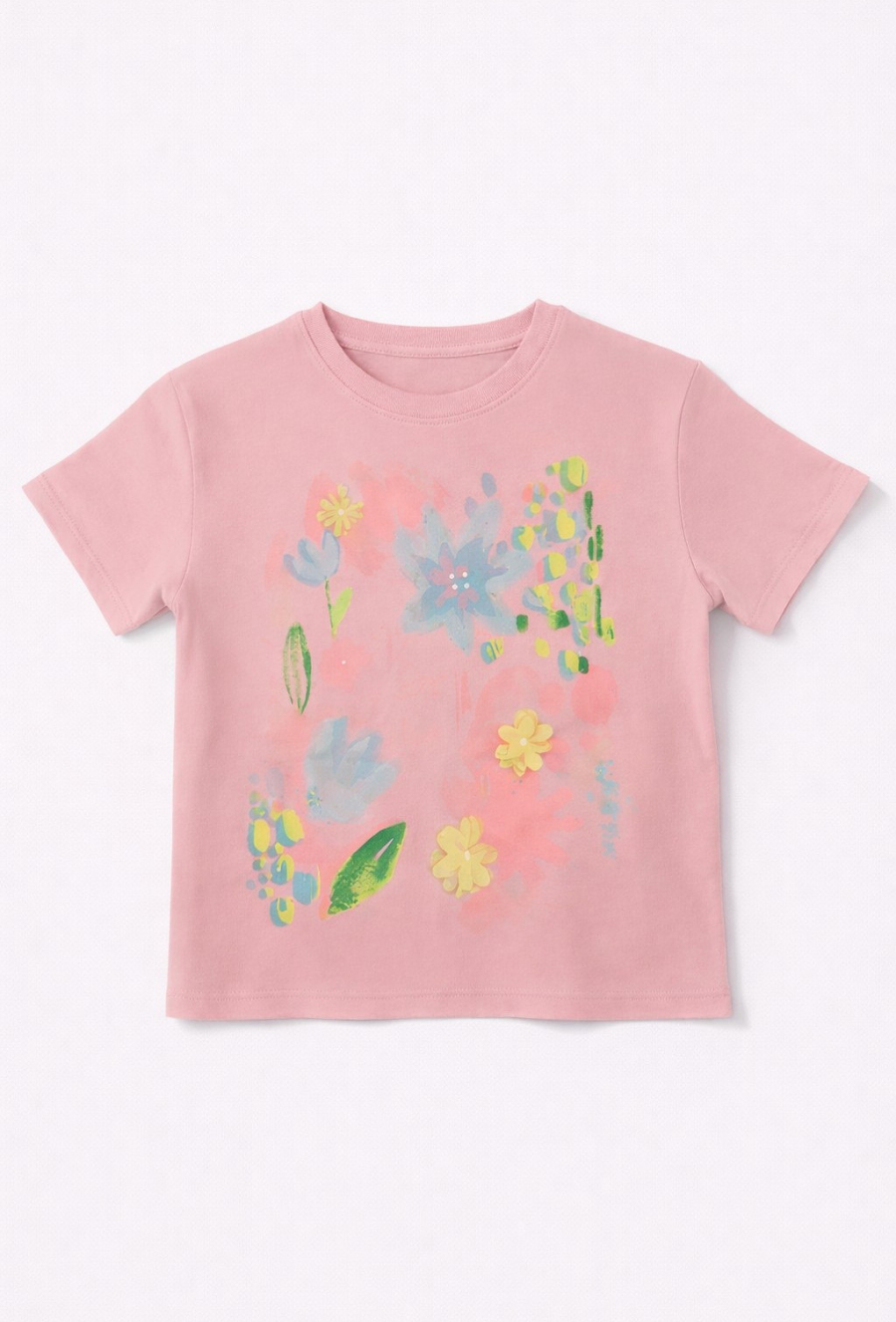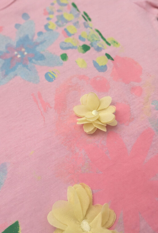 Urocza różowa koszulka dla dziewczynki to połączenie wygody i efektownych detali. Wykonana z 100% bawełny, jest miękka i przyjemna w noszeniu. Z przodu znajduje się wielokolorowy, delikatny nadruk z brokatowym wykończeniem, który pięknie mieni się w świetle. Całość uzupełniają naszywane aplikacje kwiatków oraz doszywane perełki, dzięki czemu koszulka wygląda wyjątkowo i świetnie sprawdzi się nie tylko na co dzień, ale też na rodzinne spotkania czy urodziny.