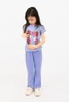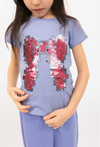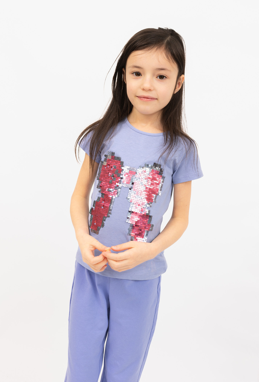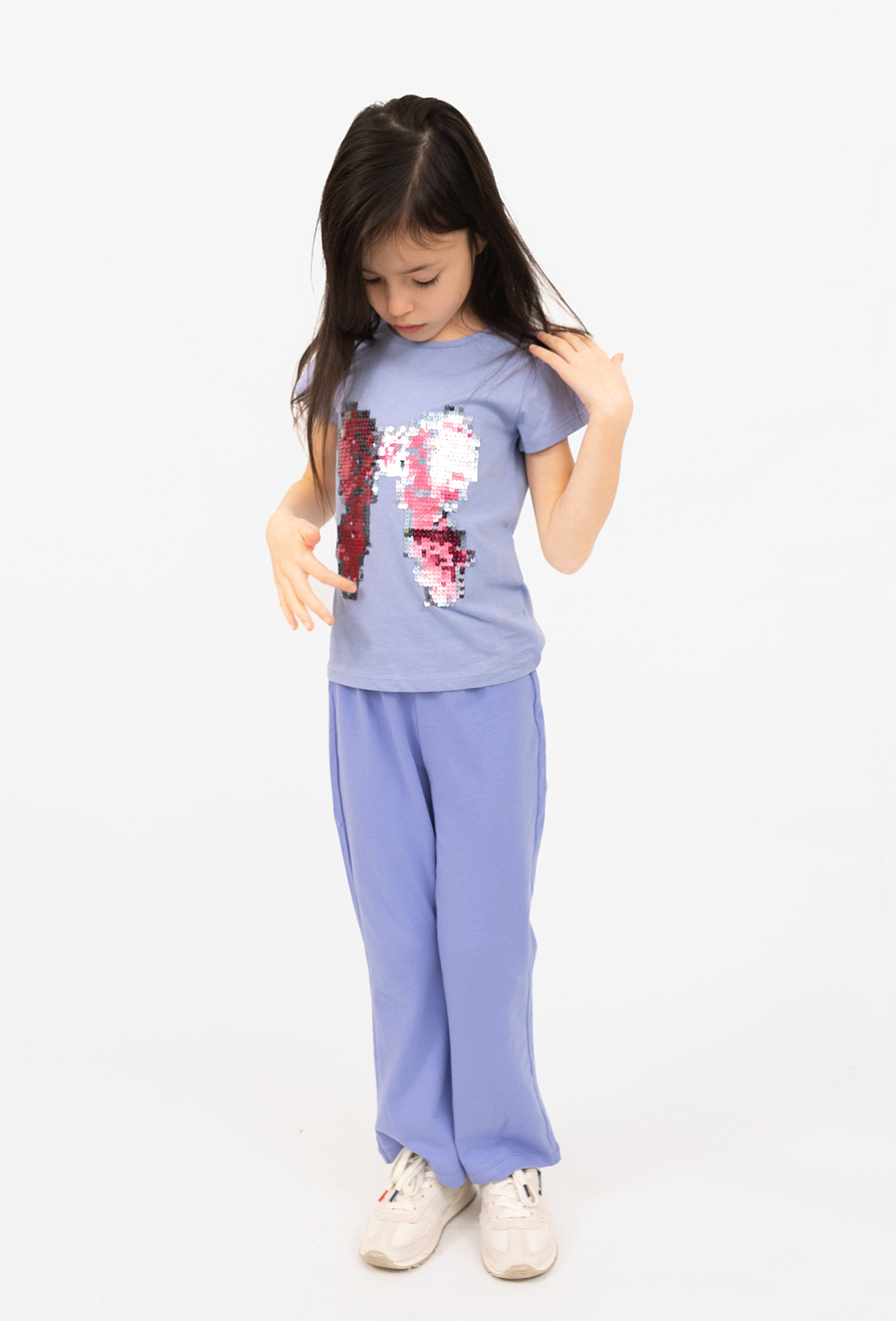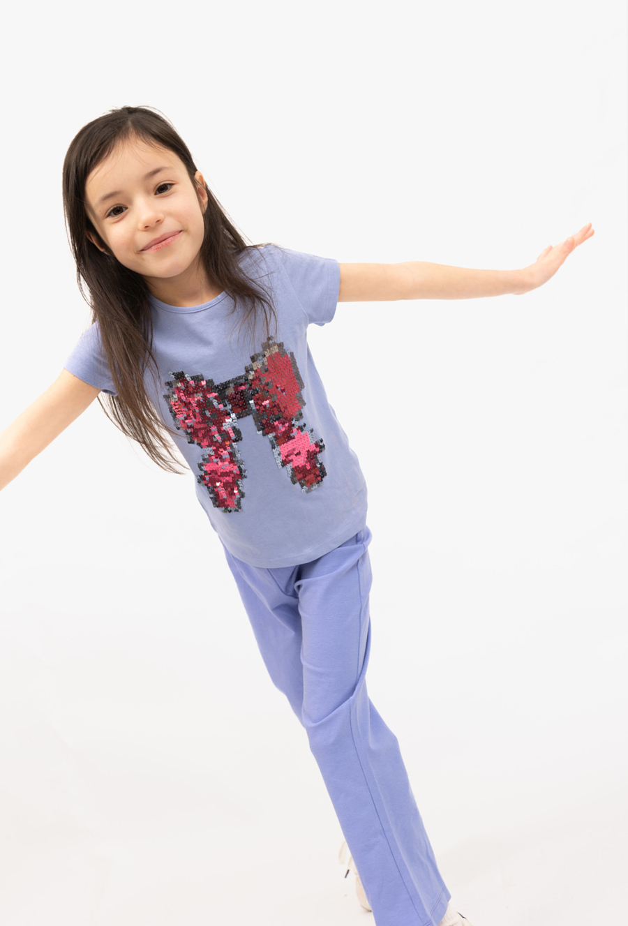 Niebieska koszulka dziewczęca z krótkim rękawem, ozdobiona cekinową aplikacją w kształcie kokardy, która pięknie mieni się w świetle i dodaje stylizacji wyjątkowego charakteru. Uszyta z 100% bawełny, jest przyjemna dla skóry, lekka i idealna na cieplejsze dni. Świetnie wygląda zarówno w zestawie z jeansami, spódniczką, jak i z dresowymi spodniami.