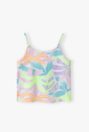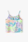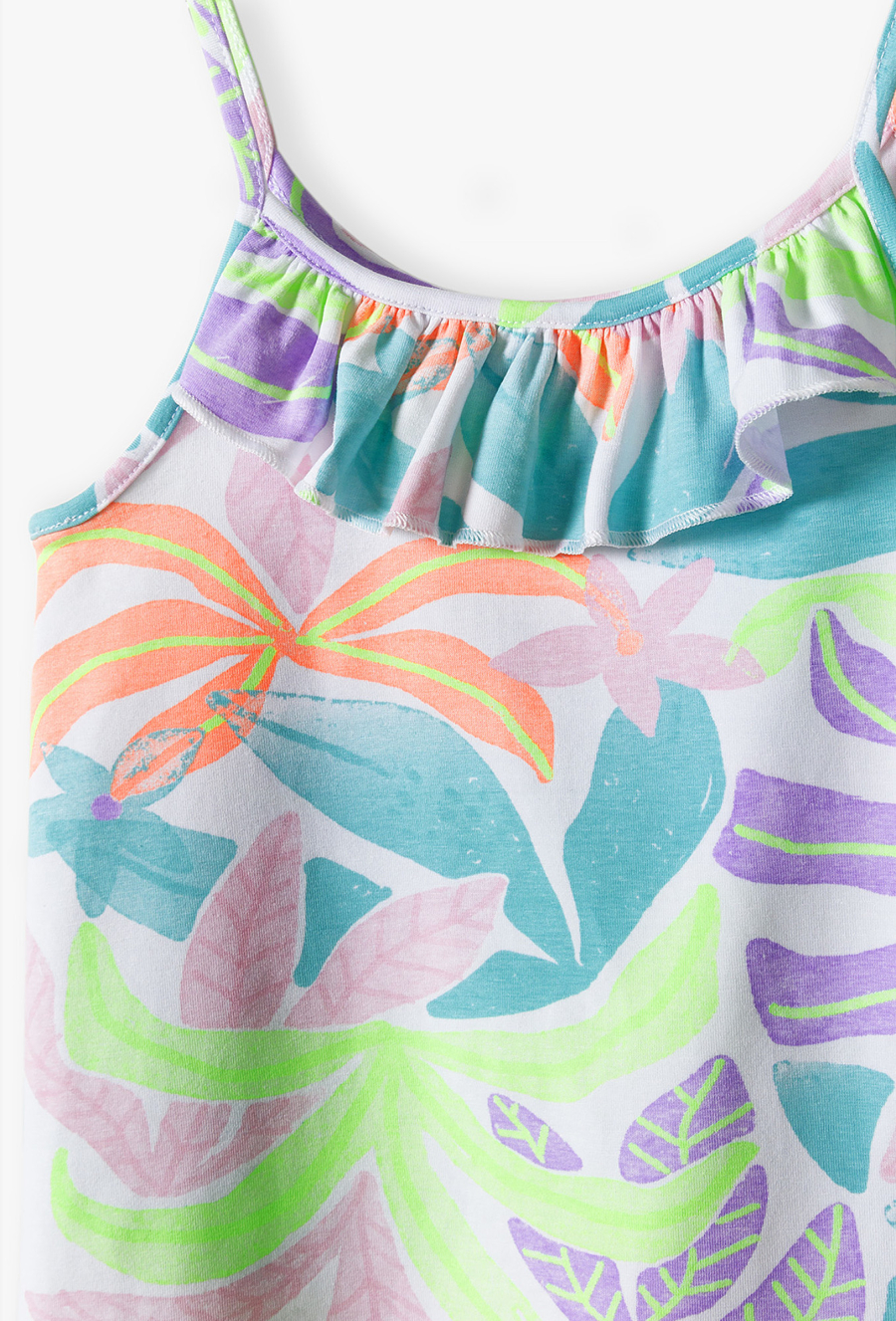 Wprowadź letnią energię do szafy swojej córeczki! Ta urocza koszulka na cienkich ramiączkach to idealne połączenie dziewczęcego wdzięku i maksymalnego komfortu. Dzięki soczystej, neonowej kolorystyce i tropikalnym motywom, top ten stanie się ulubionym elementem wakacyjnych stylizacji. Materiał pokryty jest nadrukiem egzotycznych liści i kwiatów w odcieniach fioletu, mięty oraz neonowego pomarańczu. To wzór, który przyciąga wzrok i podkreśla wakacyjną opaleniznę. Dekolt koszulki został ozdobiony delikatną, marszczoną falbanką, która nadaje całości lekkości i wyjątkowego, dziewczęcego charakteru. Cienkie, stabilne ramiączka oraz swobodny fason zapewniają pełną swobodę ruchów podczas zabawy, biegania czy budowania zamków z piasku.