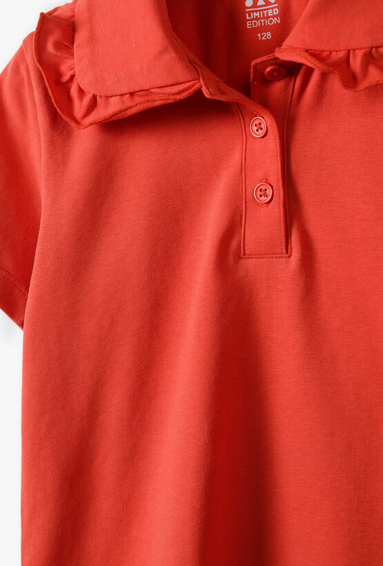 Koszulka polo z linii „Limited Edition” – dziewczęcy szyk w energetycznym kolorze. Dodaj elegancji codziennym stylizacjom swojej córeczki! Ta czerwona koszulka polo to unikalne połączenie klasycznego, sportowego fasonu z niezwykle subtelnym, kobiecym wykończeniem. Stworzona z myślą o małych damach, które chcą wyglądać stylowo podczas rodzinnych uroczystości czy ważnych dni w przedszkolu. Klasyczny kołnierzyk polo został obszyty miękką, marszczoną falbanką, która nadaje bluzce romantycznego i bardzo dziewczęcego charakteru. To detal, który wyróżnia ten model na tle standardowych ubrań. Prosty krój i krótkie rękawki sprawiają, że polo świetnie prezentuje się zarówno wpuszczone w spódniczkę, jak i noszone swobodnie do legginsów czy jeansów.