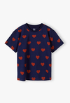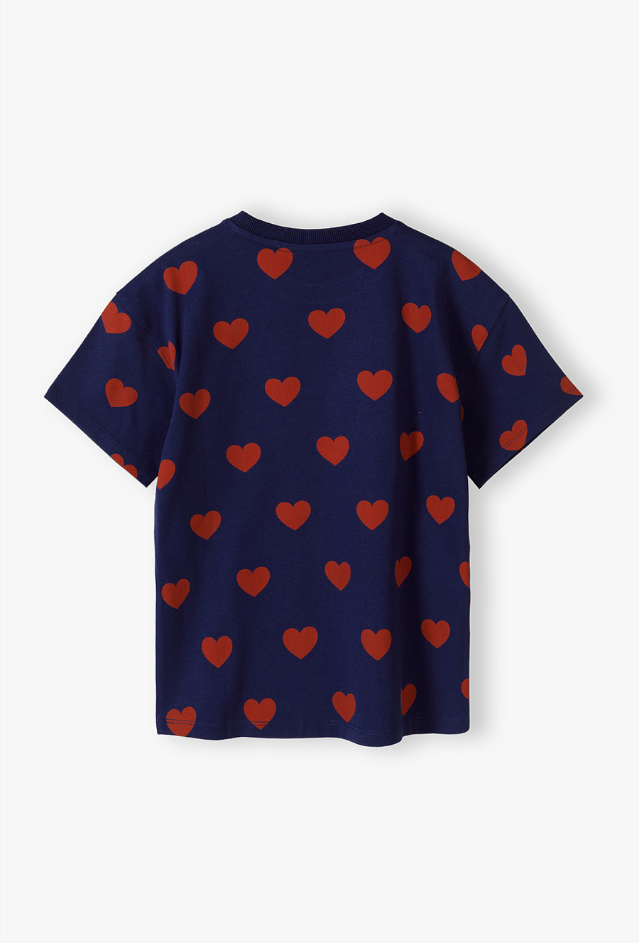 Podaruj swojej córeczce ubiór pełen miłości! Ten granatowy T-shirt to idealne połączenie klasycznej kolorystyki z uroczym, dziecięcym motywem. Został zaprojektowany z myślą o dziewczynkach, które kochają modne wzory, ale nade wszystko cenią sobie wygodę podczas codziennych przygód. Całą powierzchnię koszulki zdobią regularnie rozmieszczone, czerwone serca. Kontrast soczystej czerwieni z głębokim granatem nadaje ubraniu wyrazistego, radosnego charakteru. Ta koszulka stworzy fantastyczny zestaw z czerwonymi szortami, klasycznymi jeansami lub prążkowanymi legginsami.