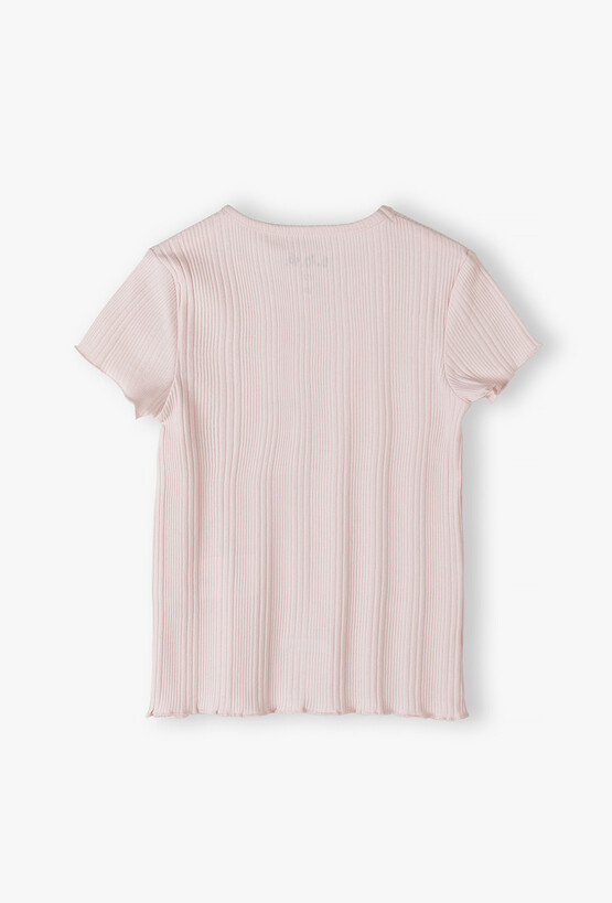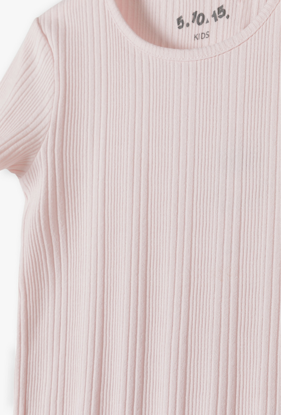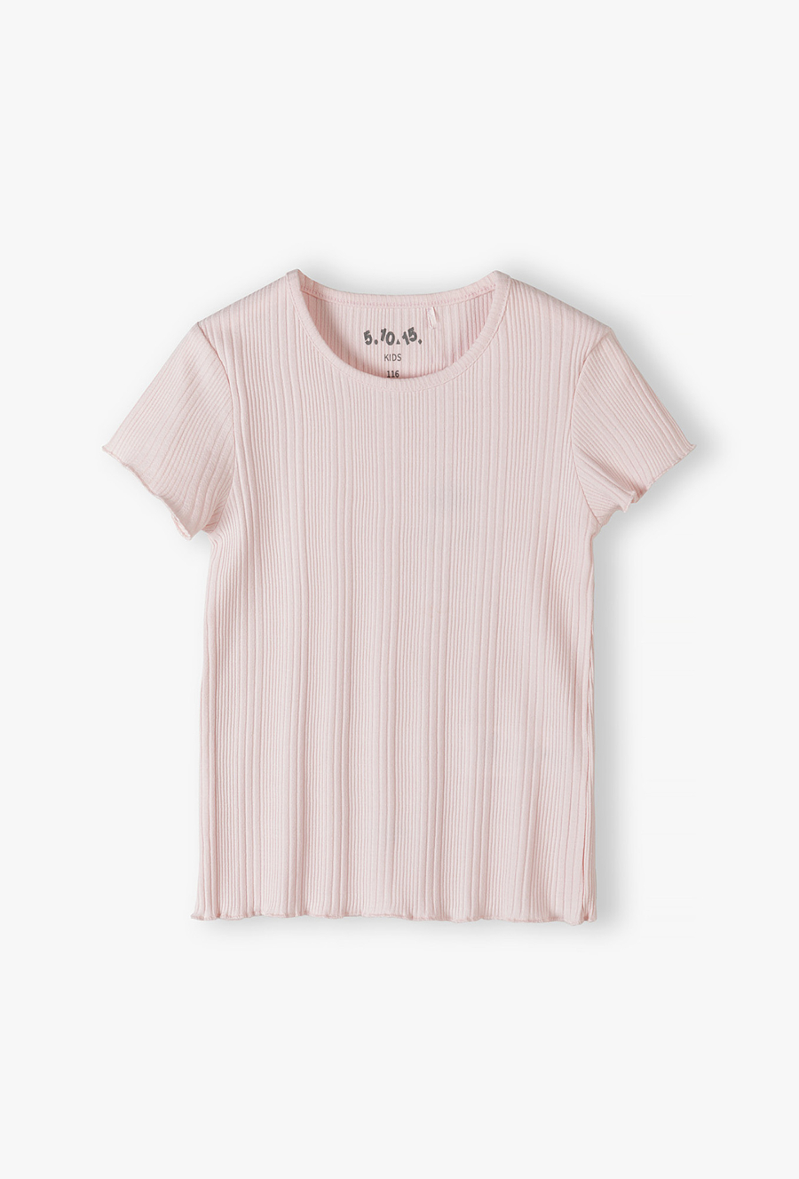 Prążkowany T-shirt w kolorze pudrowego różu – subtelność i komfort w stylu basic. Szukasz bazy, która połączy wygodę z modnym wyglądem? Ta jasnoróżowa koszulka z krótkim rękawem to idealny wybór dla małej elegantki. Dzięki ciekawej strukturze materiału, nawet najprostsza stylizacja nabierze wyjątkowego charakteru. Dzianina o wyraźnym pionowym prążkowaniu sprawia, że koszulka jest bardzo elastyczna, świetnie dopasowuje się do sylwetki i prezentuje się niezwykle nowocześnie. Delikatny, pudrowy róż to kolor, który nigdy nie wychodzi z mody. Doskonale pasuje do jeansowych ogrodniczek, kwiecistych spódniczek czy klasycznych legginsów.