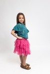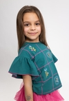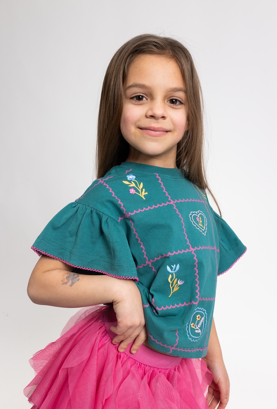 Uroczy i wygodny zielony T-shirt o fasonie pudełkowym to idealna baza do codziennych stylizacji. Luźniejszy krój zapewnia swobodę ruchów. Model wyróżniają efektowne detale: rękawki wykończone falbanką, kontrastowe przeszycia tworzące ozdobną kratkę oraz delikatne hafty w kwiatki, które dodają całości dziewczęcego uroku. Świetnie wygląda zarówno z legginsami, jak i ze spódniczką czy szortami.
