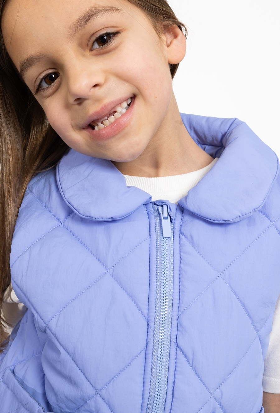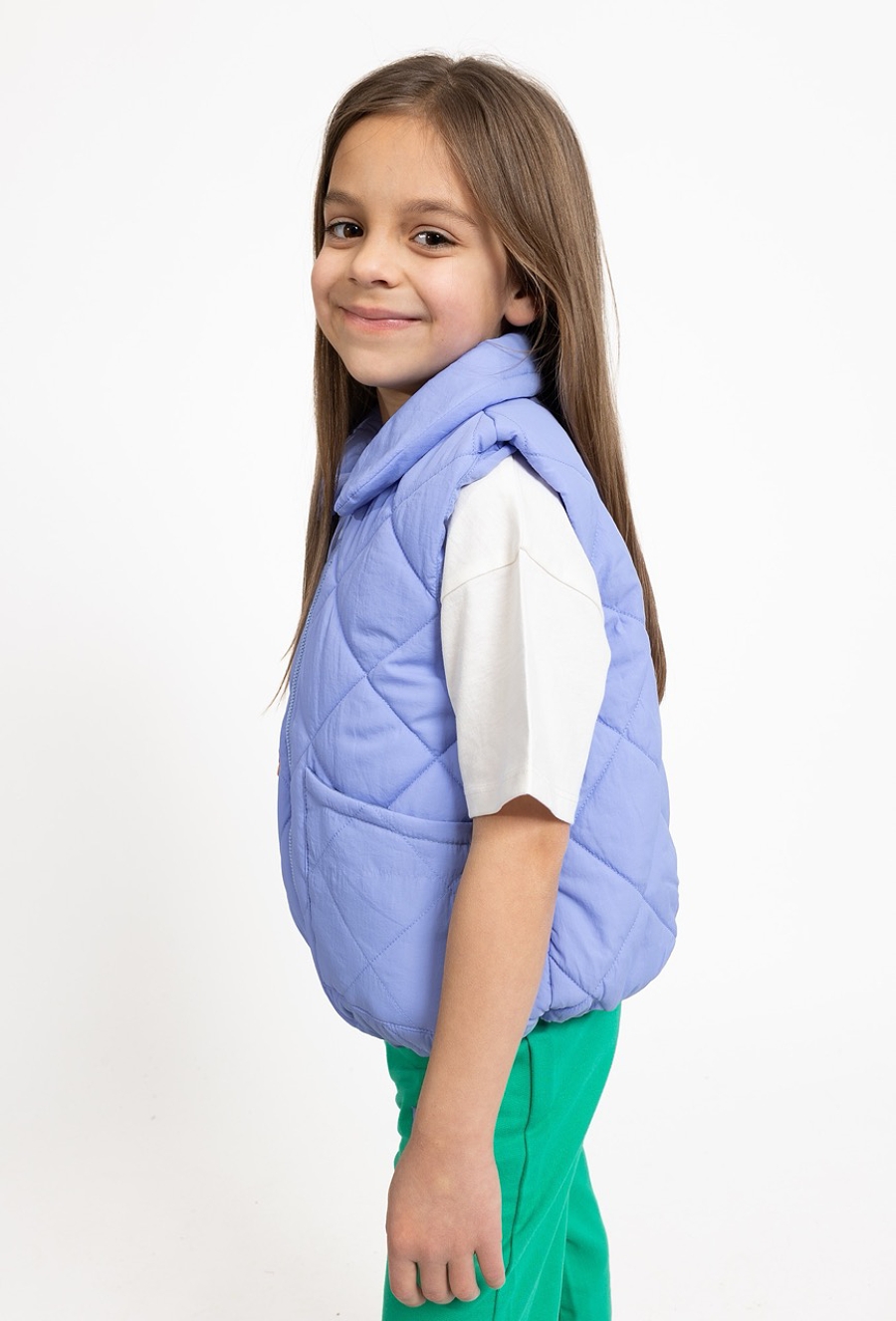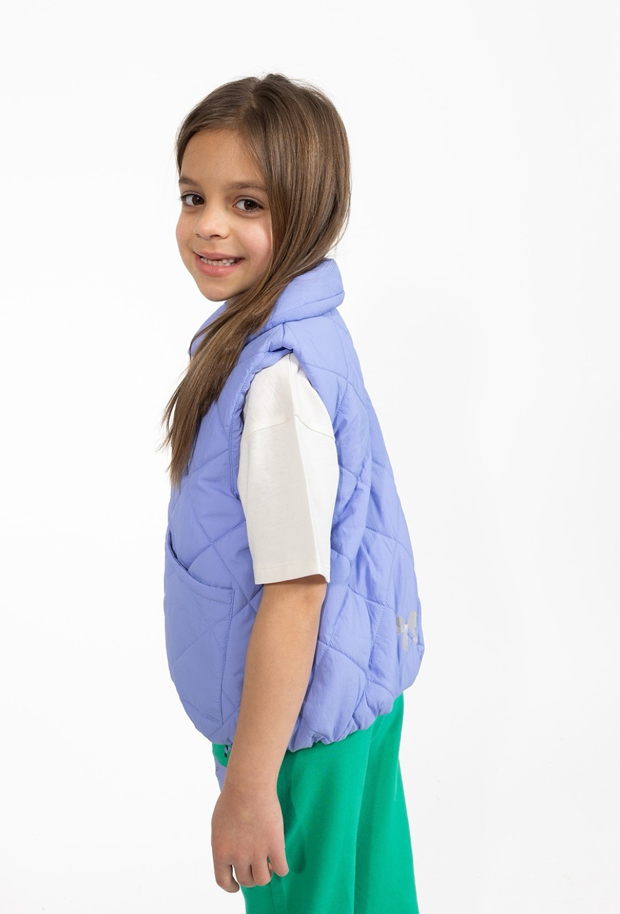 Pikowany bezrękawnik dla dziewczynki to praktyczna warstwa na chłodniejsze dni – bez ograniczania ruchów. Jest lekki, wiatrochronny, oddychający i szybko schnie, a jednocześnie pomaga utrzymać ciepło. Model ma zapięcie na zamek, dwie kieszenie z przodu oraz miękki kołnierzyk, który przyjemnie otula szyję. Klasyczne pikowanie i delikatny kolor sprawiają, że łatwo dopasujesz go do codziennych stylizacji – do bluzy, swetra czy sukienki.