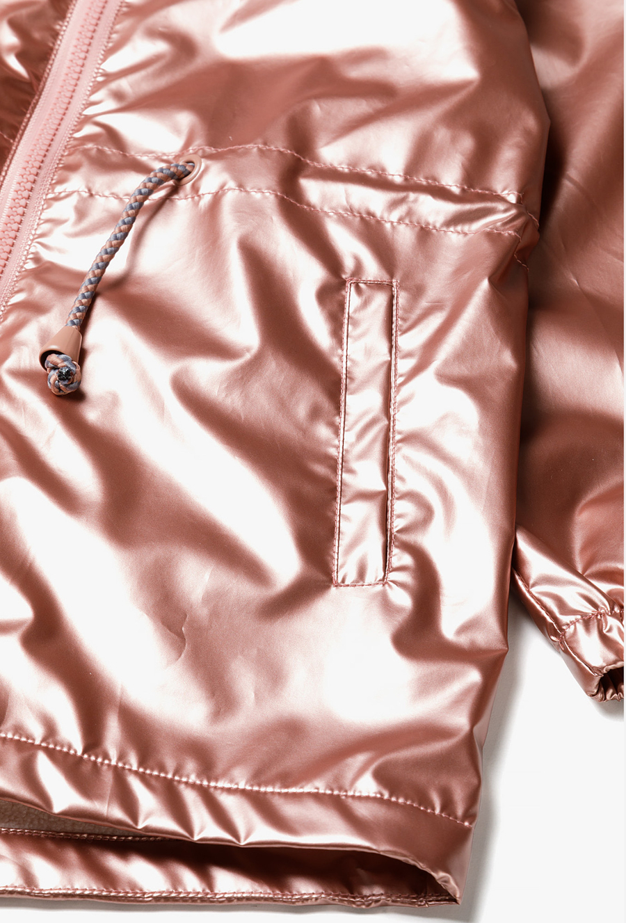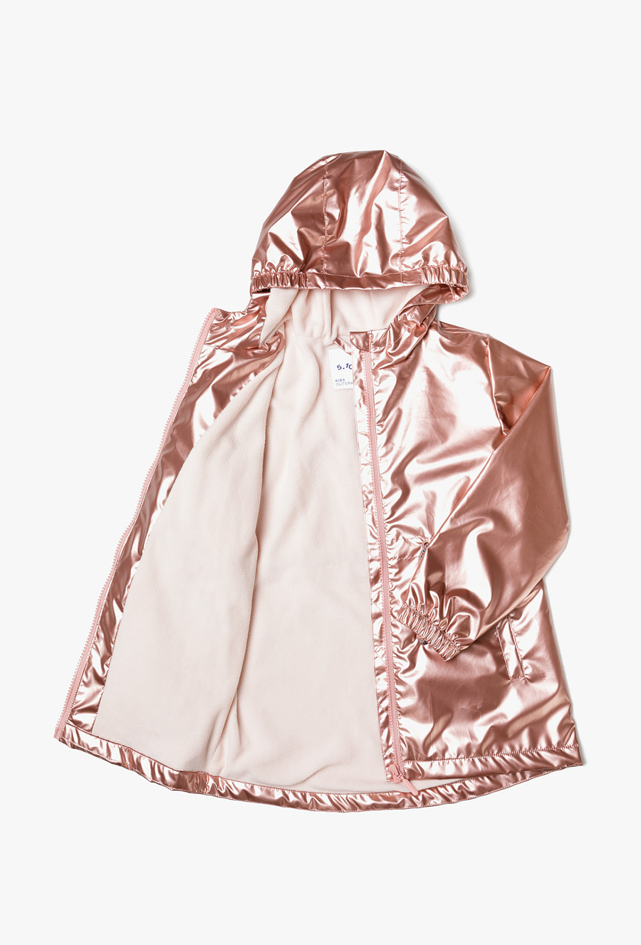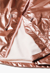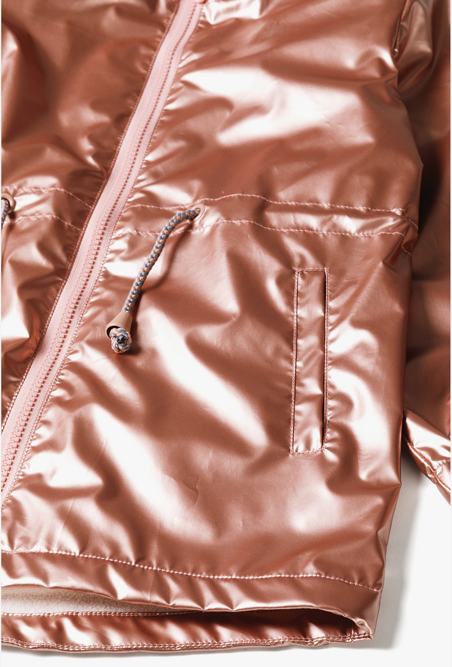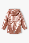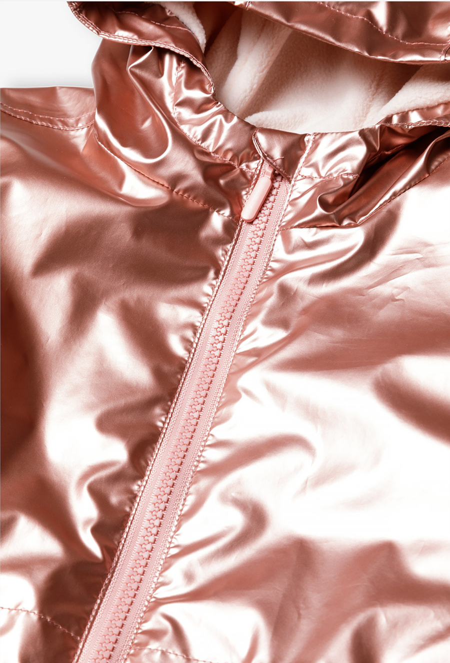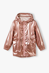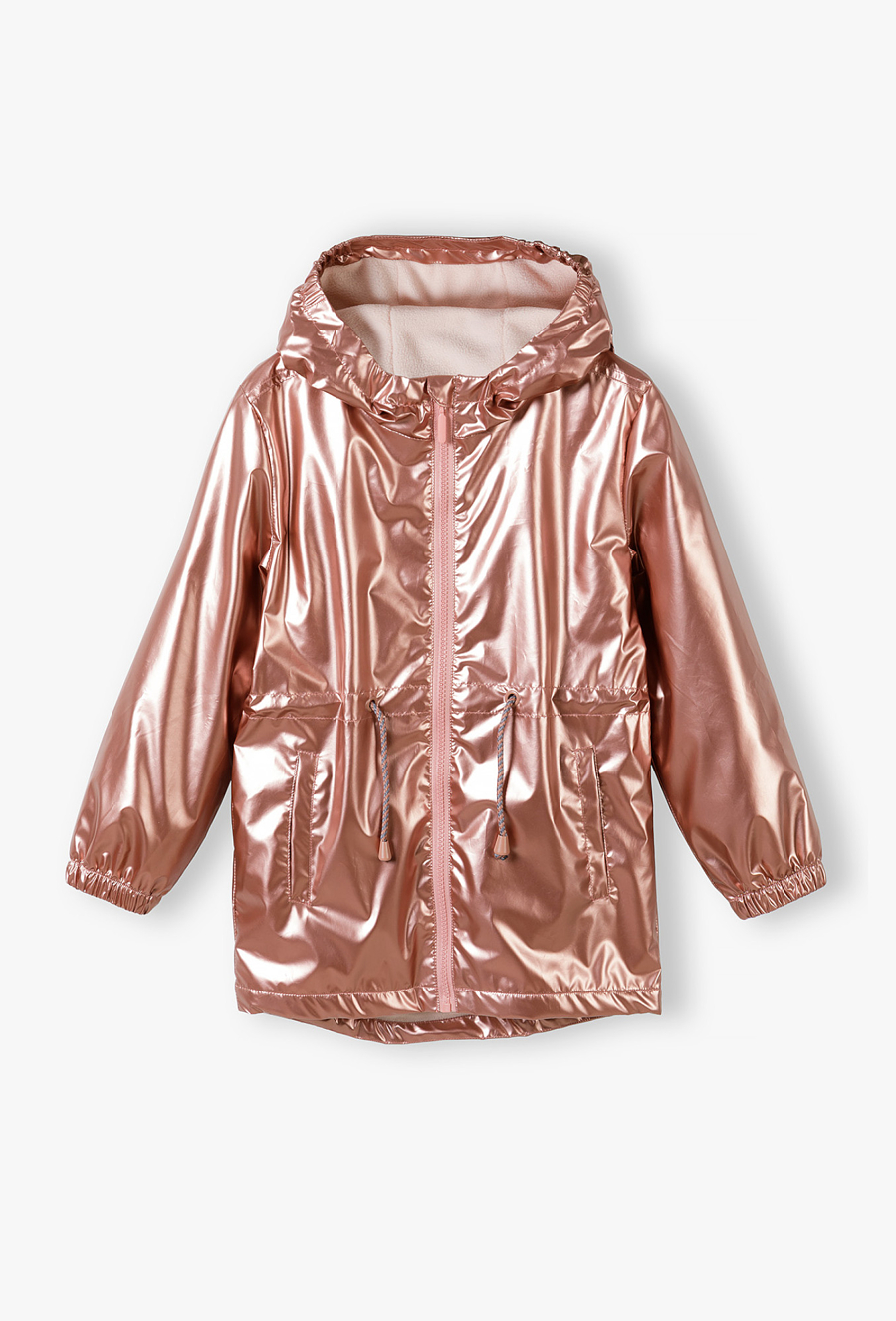 Pozwól swojej córeczce wyróżnić się z tłumu! Ta metaliczna kurtka parka to absolutny hit sezonu, który łączy futurystyczny blask z funkcjonalnością klasycznej parki. Dzięki efektownemu wykończeniu w kolorze różowego złota i przytulnemu wnętrzu, kurtka ta sprawi, że nawet pochmurny wiosenny dzień stanie się radosny. Materiał zewnętrzny pięknie odbija światło, nadając kurtce nowoczesny, luksusowy wygląd. Odcień brudnego różu w wersji metallic to jeden z najmodniejszych trendów w modzie dziecięcej. Cała kurtka, w tym również kaptur, została wyłożona miękkim, jasnym polarem. Zapewnia on doskonałą izolację termiczną w chłodniejsze wiosenne poranki i wieczory. W pasie umieszczono praktyczne sznureczki ze stoperami, które pozwalają na regulację szerokości i dopasowanie kurtki do sylwetki, chroniąc jednocześnie przed wiatrem. Okrągły element odblaskowy na plecach dba o lepszą widoczność dziecka po zmroku.