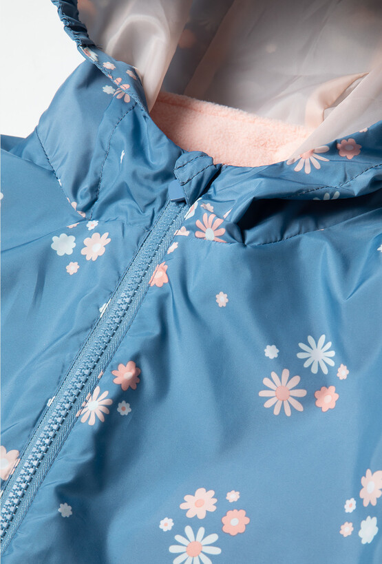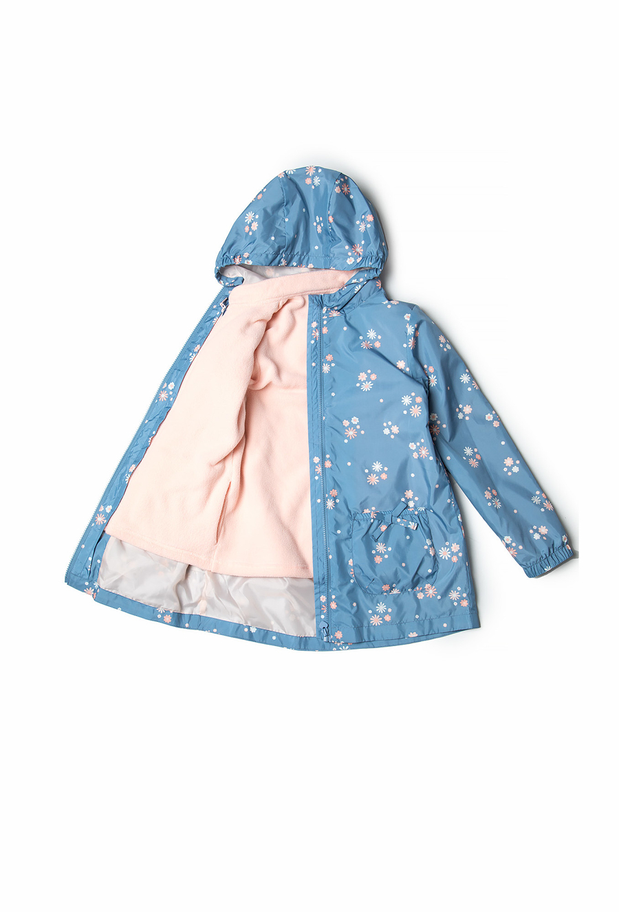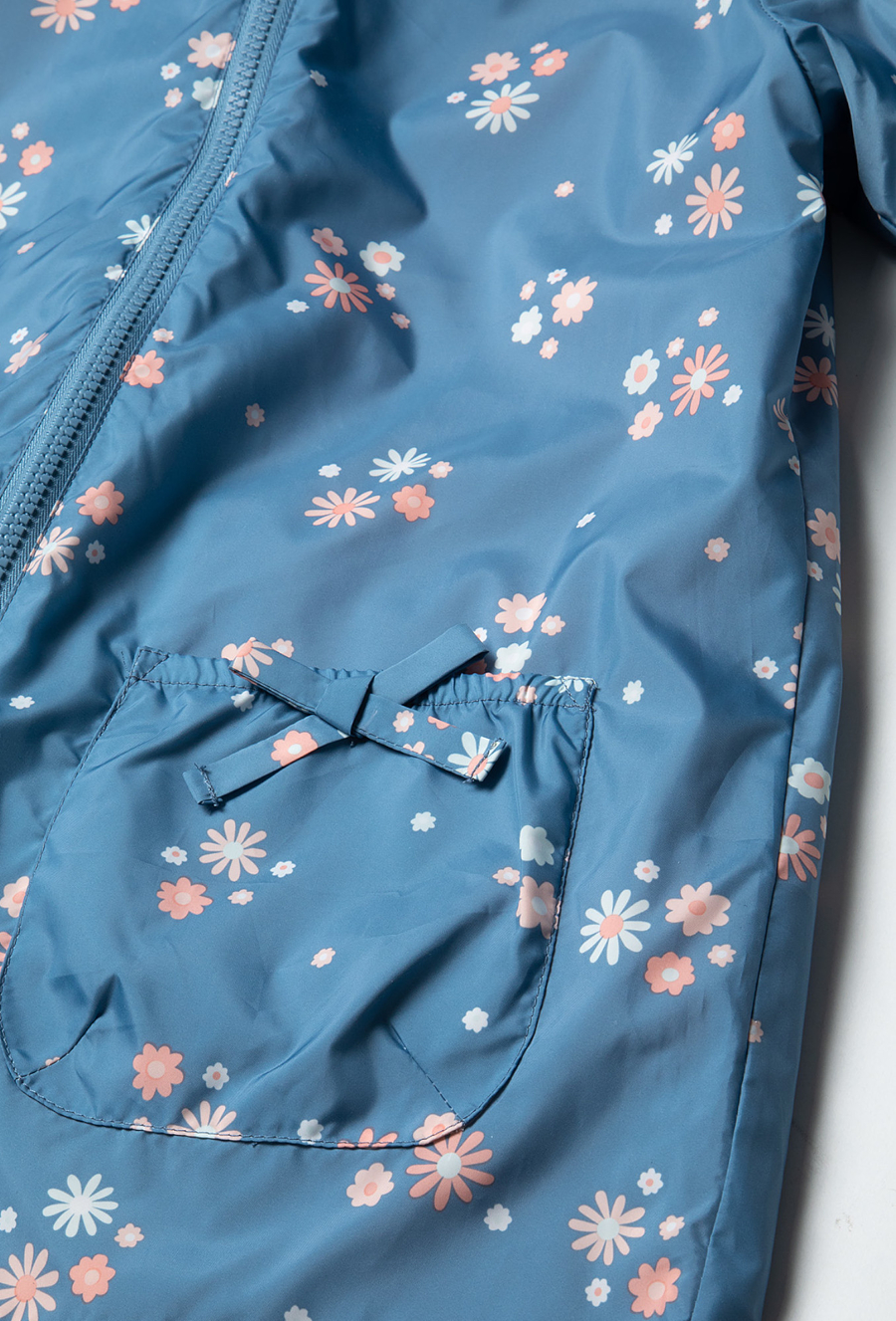 Wprowadź kolory do wiosennej garderoby swojej córeczki! Ten niebieski płaszczyk typu trencz to idealne połączenie klasycznego kroju z uroczym, dziecięcym nadrukiem. Został zaprojektowany, aby chronić przed zmienną pogodą, dodając przy tym uśmiechu każdej stylizacji. Cały płaszczyk zdobią drobne, białe i różowe kwiatuszki oraz stokrotki. Ten wzór nadaje ubraniu radosnego, wiosennego charakteru. Wnętrze trencza zostało wyłożone miękkim, brzoskwiniowym polarem. Zapewnia on optymalny komfort termiczny w chłodniejsze poranki i wieczory, będąc przy tym niezwykle miłym w dotyku. Ten trencz stworzy fantastyczny, wiosenny komplet z prążkowanymi legginsami w kolorze pudrowego różu lub jasnego różu.