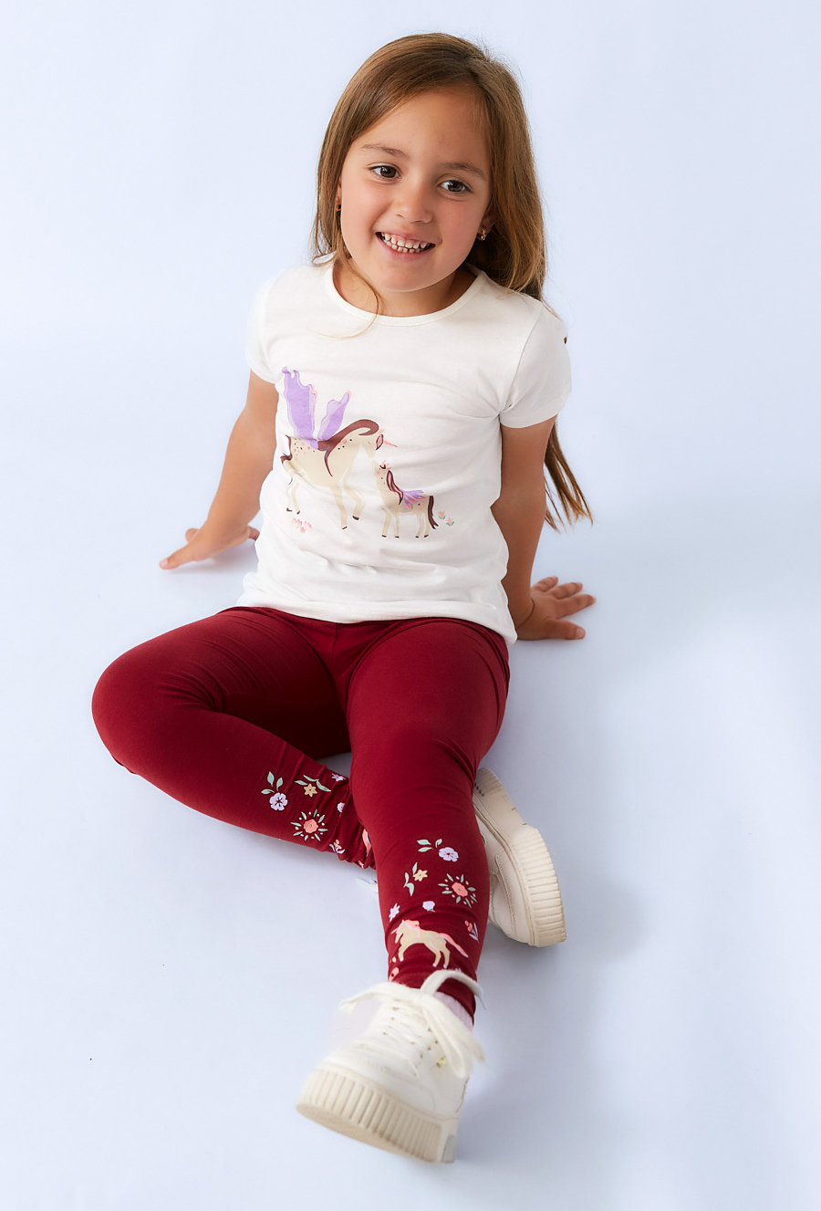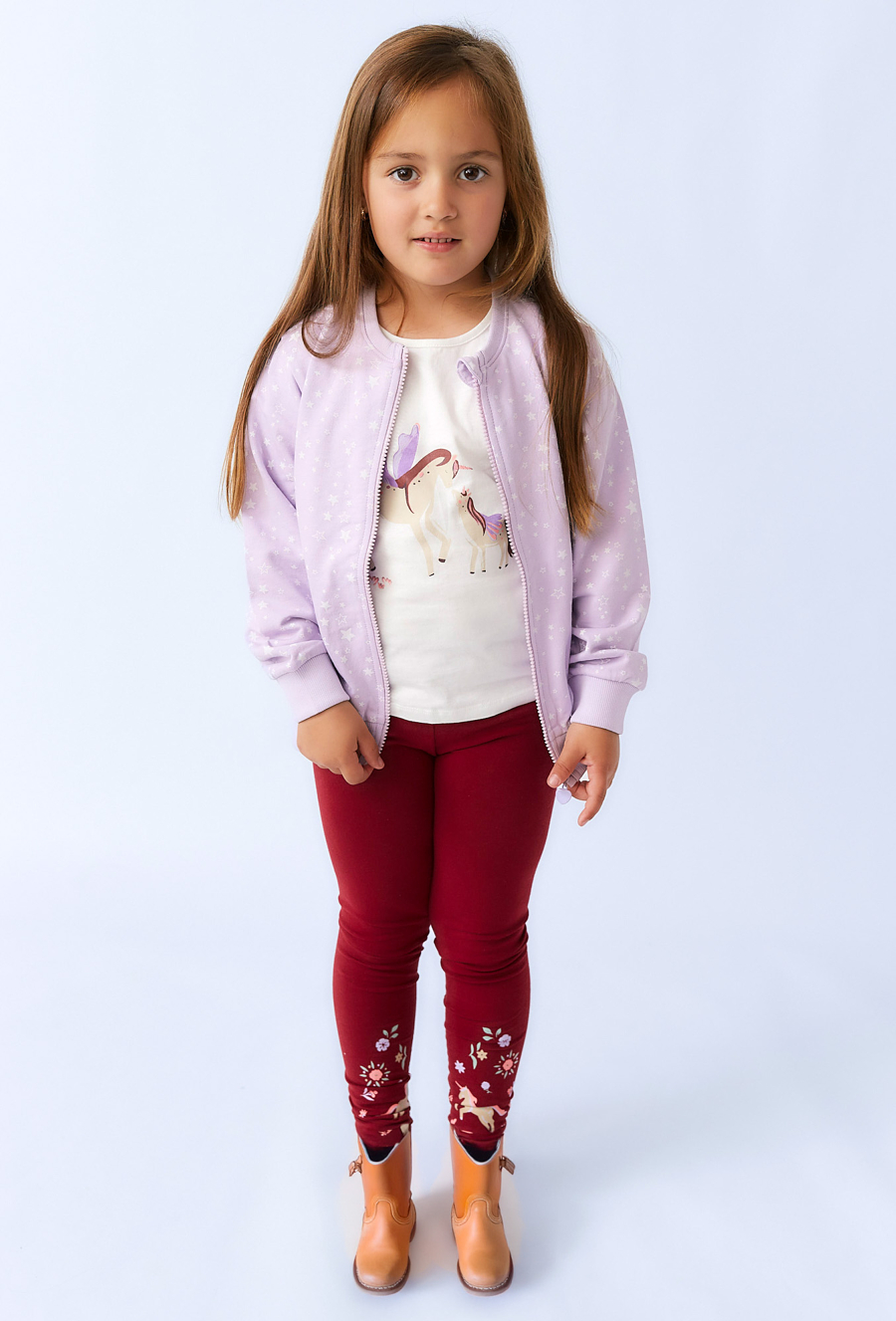 Bordowe legginsy dziewczęce wykonane z miękkiej dzianiny bawełnianej z dodatkiem elastanu, zapewniają pełną swobodę ruchów i świetne dopasowanie. Nogawki ozdobione są subtelnym nadrukiem kwiatów i jednorożców, który dodaje całości uroku i wyjątkowego charakteru. Idealne na co dzień – do szkoły, przedszkola czy weekendowych spacerów. Wygodne, miękkie i stylowe – legginsy, które pokochają wszystkie małe dziewczynki!