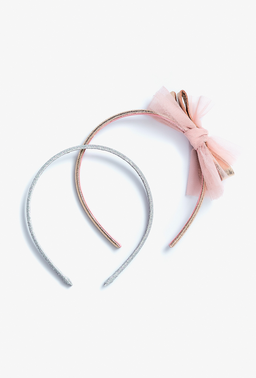 Zestaw dwóch stylowych opasek do włosów dla dziewczynki, które dodadzą uroku każdej fryzurze. W komplecie znajdują się: - srebrna opaska z delikatnym brokatowym połyskiem – uniwersalna i elegancka. - różowo-złota opaska z tiulową kokardą – ozdobiona lekką, dziewczęcą kokardką z tiulu, idealna na wyjątkowe okazje. Opaski są elastyczne, lekkie i wygodne w noszeniu – nie uciskają głowy, a jednocześnie dobrze trzymają się we włosach.