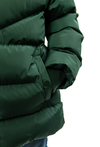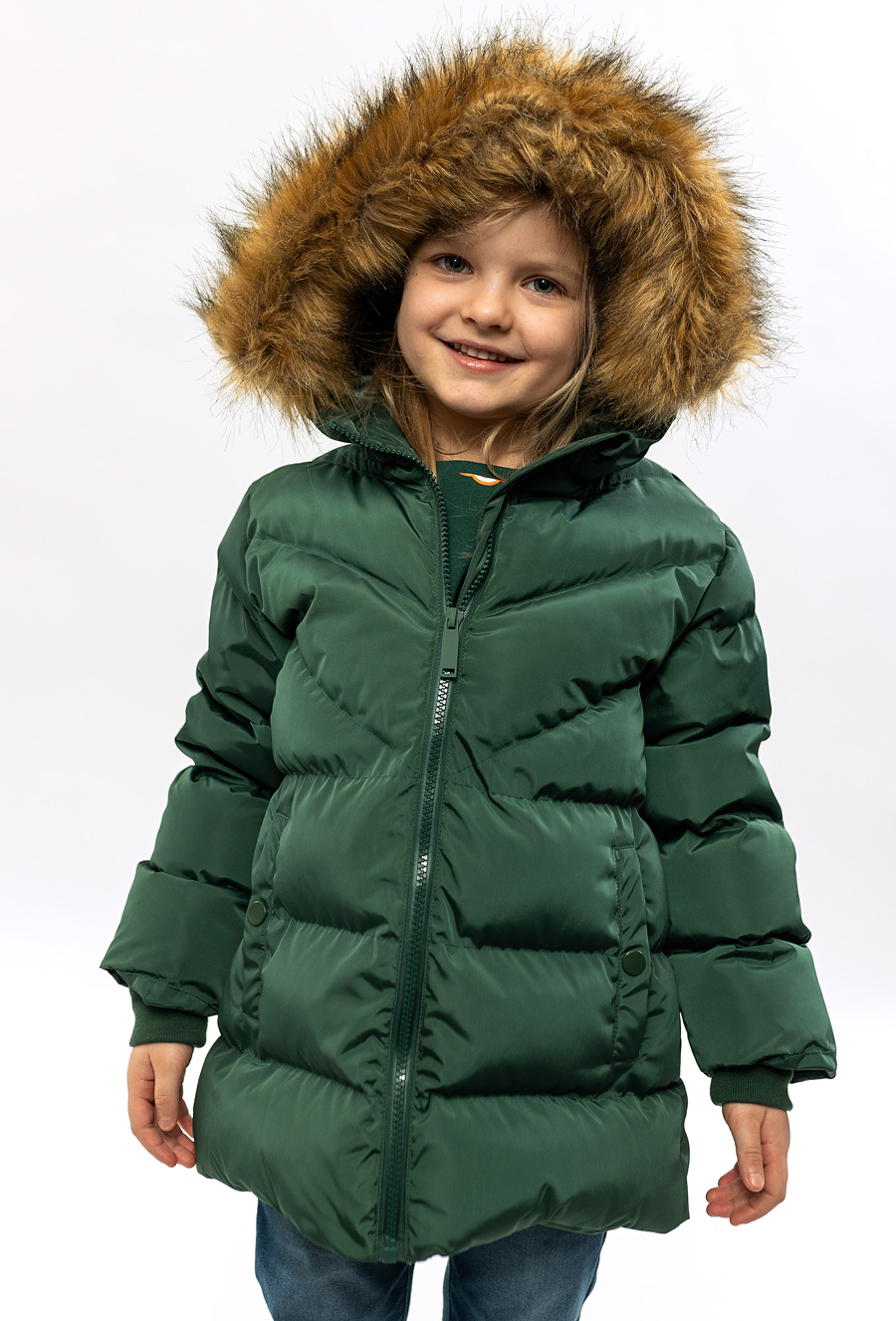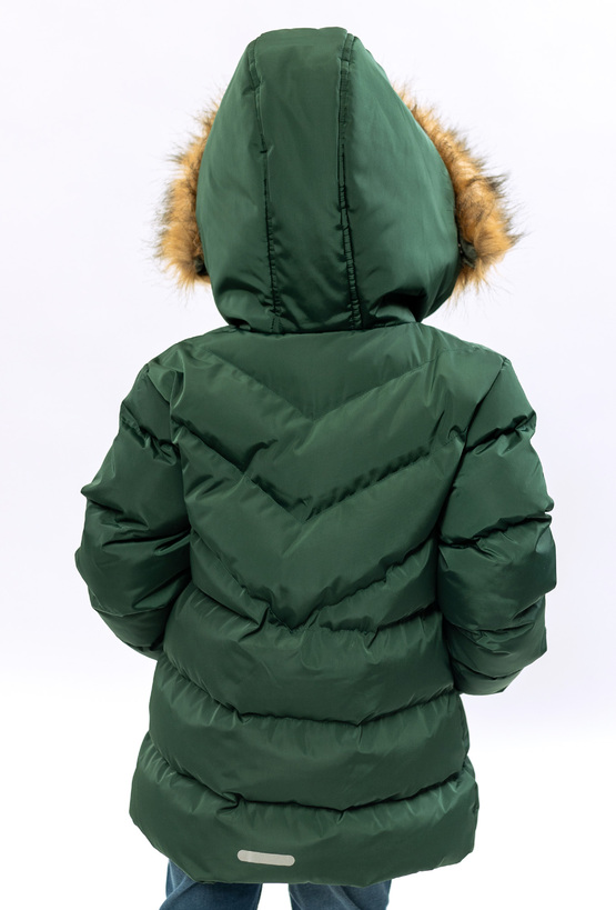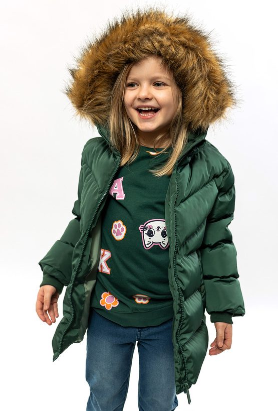 Stylowa i praktyczna pikowana kurtka zimowa dla dziewczynki w zielonym kolorze. Kurtka ma kaptur wykończony futerkiem, który chroni przed wiatrem i dodaje uroku zimowym stylizacjom. Wygodny krój sprawdzi się na co dzień – do przedszkola, na spacer i zimowe zabawy.