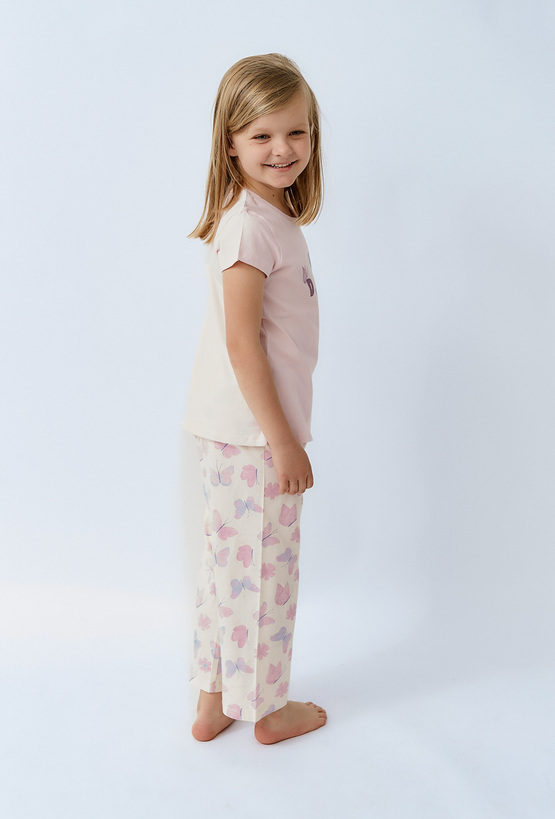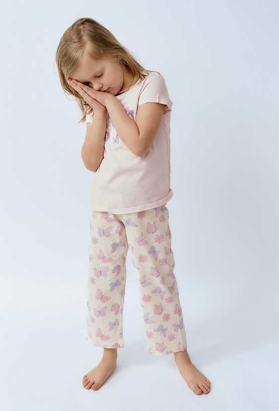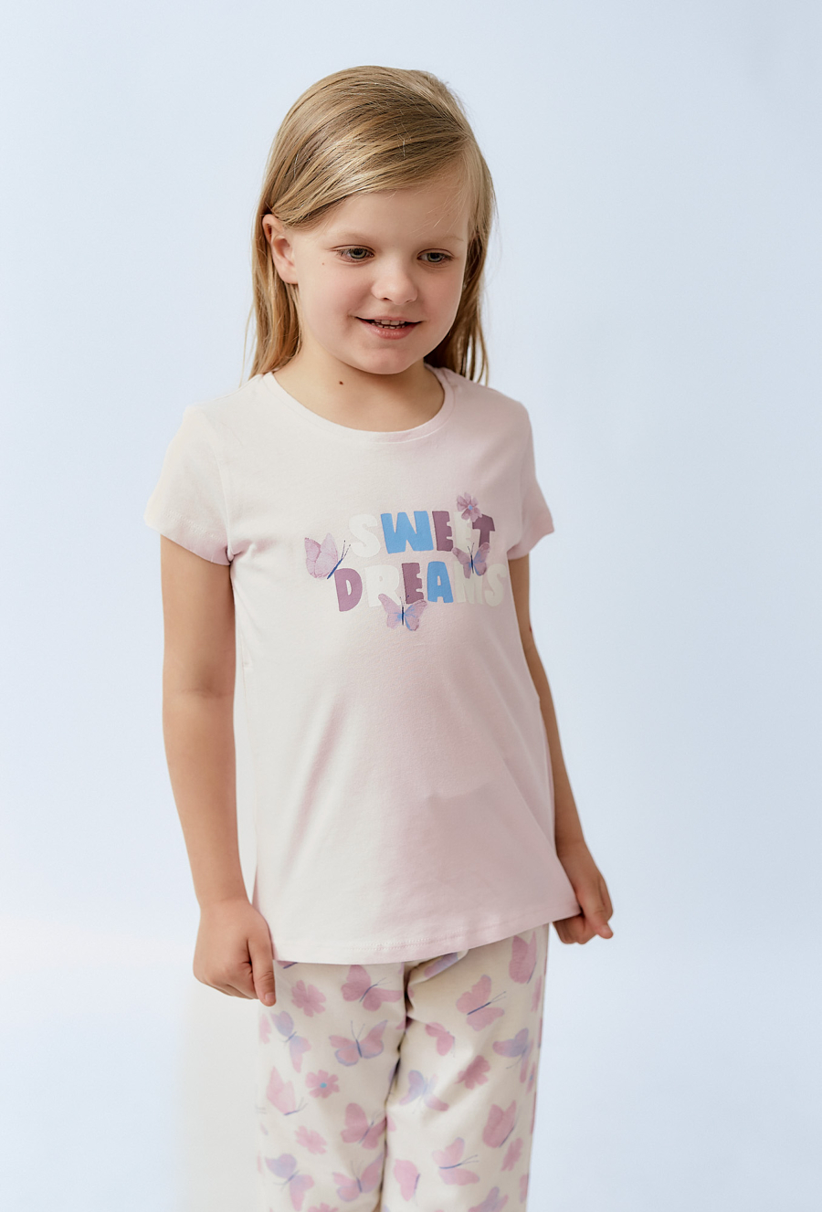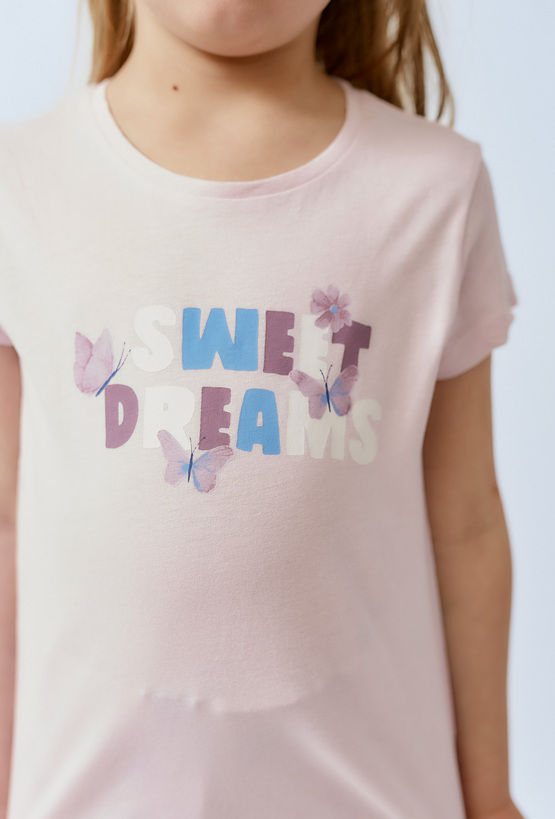 Lekka, dziewczęca i bardzo wygodna — piżama „Sweet Dreams” to komplet idealny na spokojne noce i leniwe poranki. Zestaw składa się z jasnoróżowej koszulki z krótkim rękawem oraz kremowych spodni ozdobionych pastelowym nadrukiem motyli. Delikatna grafika z napisem „Sweet Dreams” i subtelnymi motylkami dodaje całości uroku, a stonowane kolory świetnie sprawdzą się przez cały rok. Spodnie mają prosty, komfortowy krój, dzięki czemu dziecko może swobodnie się poruszać, a piżama sprawdzi się także jako domowy zestaw do odpoczynku.