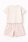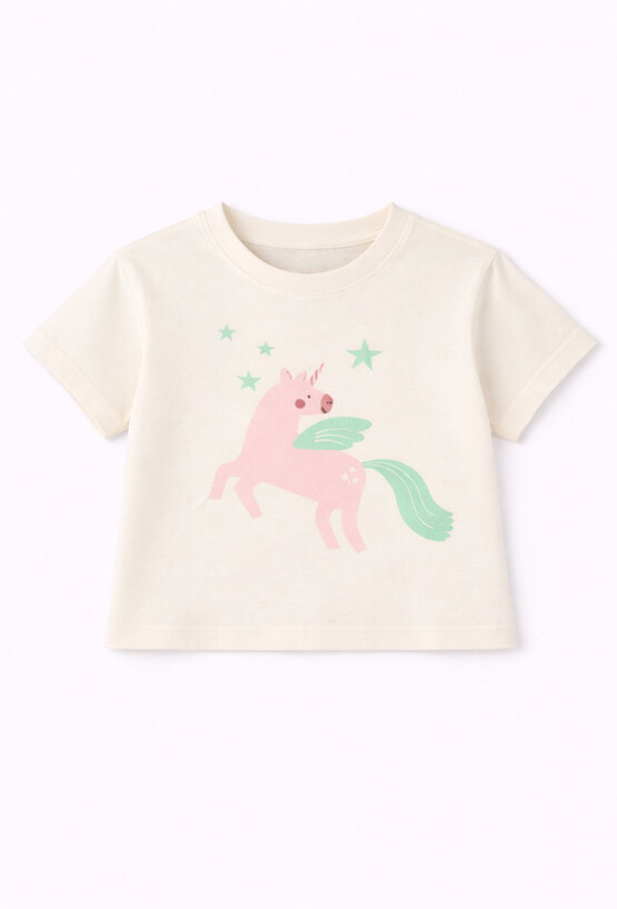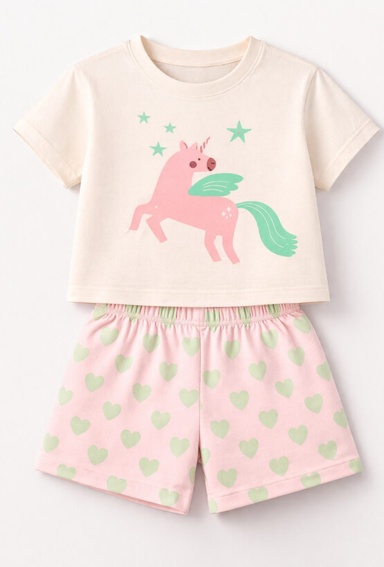 Zadbaj o kolorowe sny swojej córeczki dzięki tej wyjątkowo słodkiej piżamie. Komplet został zaprojektowany z myślą o potrzebach najmłodszych – łączy w sobie bajkowy design z najwyższą dbałością o komfort delikatnej skóry dziecka. Koszulka o swobodnym kroju. Przód zdobi duża, przyjazna grafika przedstawiająca różowego jednorożca ze skrzydłami i miętową grzywą, otoczonego gwiazdkami. Szeroki dekolt ułatwia zakładanie koszulki przez głowę. Krótkie spodenki w kolorze jasnoróżowym, ozdobione regularnym wzorem w miętowe serduszka. Elastyczny, miękki pas zapewnia doskonałe trzymanie bez uciskania brzuszka, co jest kluczowe dla spokojnego snu.