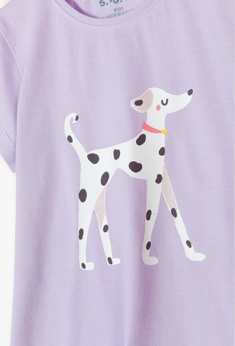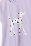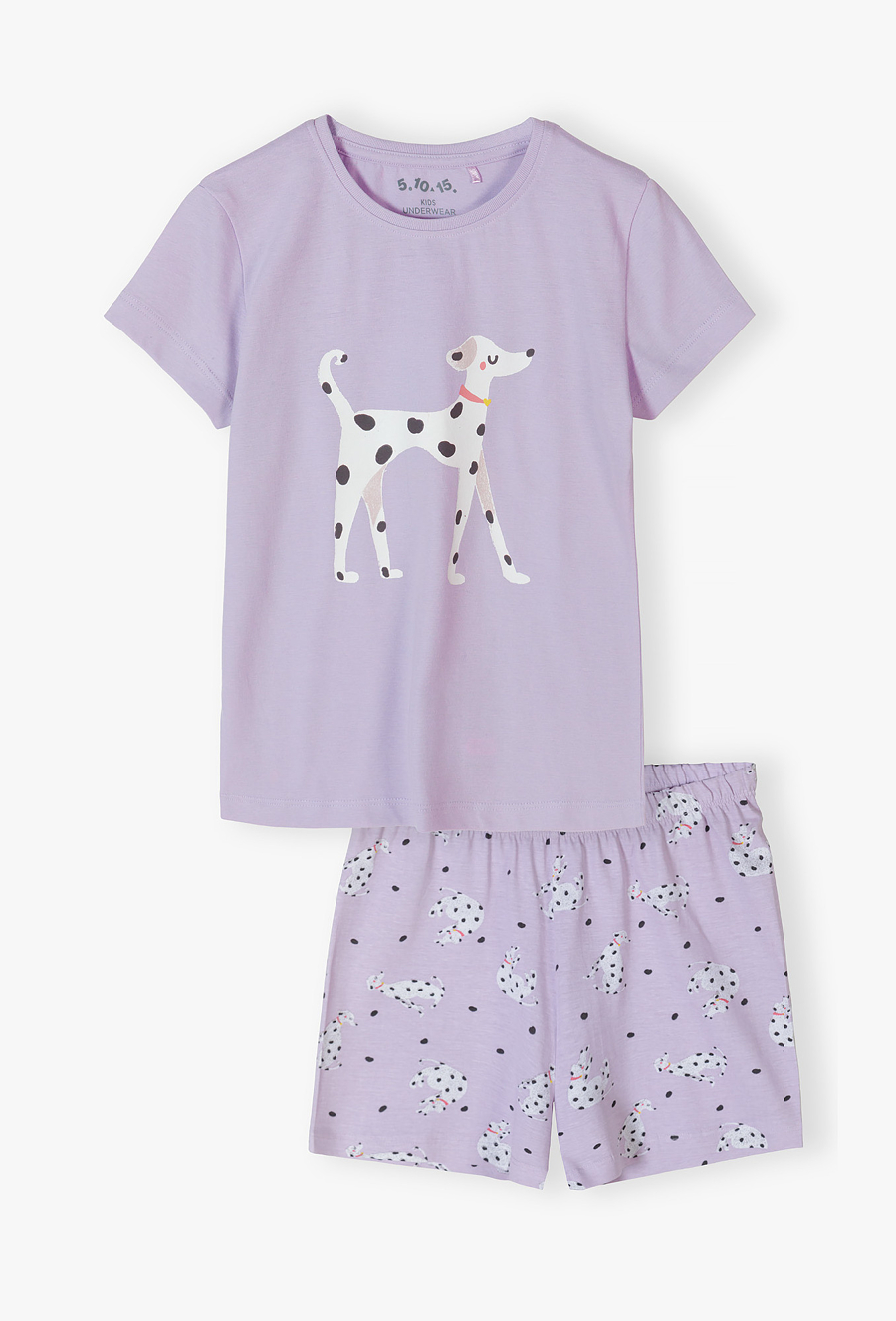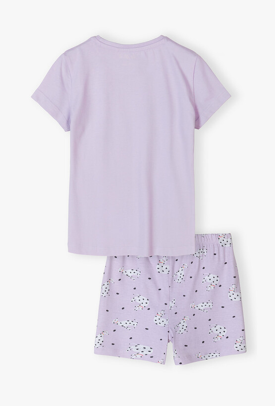 Zapewnij swojej córeczce najwyższy komfort snu w uroczym, liliowym wydaniu! Ten dwuczęściowy komplet piżamowy to idealne połączenie delikatnej kolorystyki z modnym motywem pieska. Piżama doskonale sprawdzi się podczas ciepłych, letnich nocy oraz wieczornego odpoczynku. Centralną część liliowej koszulki zdobi duży nadruk eleganckiego dalmatyńczyka w różowej obroży ze złotym serduszkiem. To wzór, który wywoła uśmiech na twarzy każdej małej miłośniczki zwierząt. Krótkie spodenki w tym samym liliowym odcieniu pokryte są radosnym nadrukiem małych dalmatyńczyków oraz czarnych kropek. Tworzy to spójną i niezwykle stylową całość.