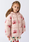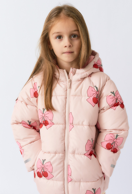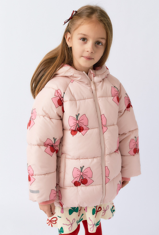 Pikowana kurtka zimowa dla dziewczynki w jasnoróżowym kolorze, ozdobiona nadrukiem w wiśnie i kokardki. Zapewnia doskonałą ochronę przed chłodem i wiatrem. Wyposażona w ciepły kaptur, miękką podszewkę oraz zamek błyskawiczny na całej długości. Luźniejszy krój pozwala swobodnie nosić pod spodem dodatkowe warstwy ubrań. Idealna na zimowe spacery i codzienne przygody w chłodne dni.