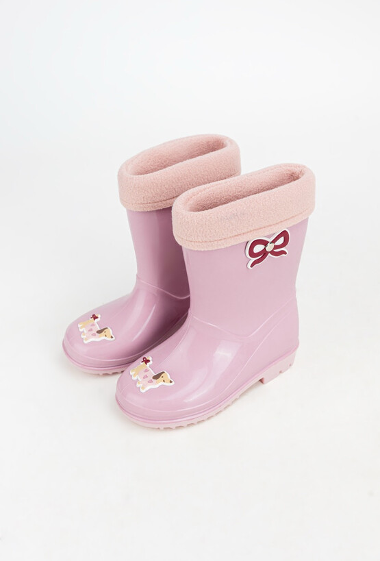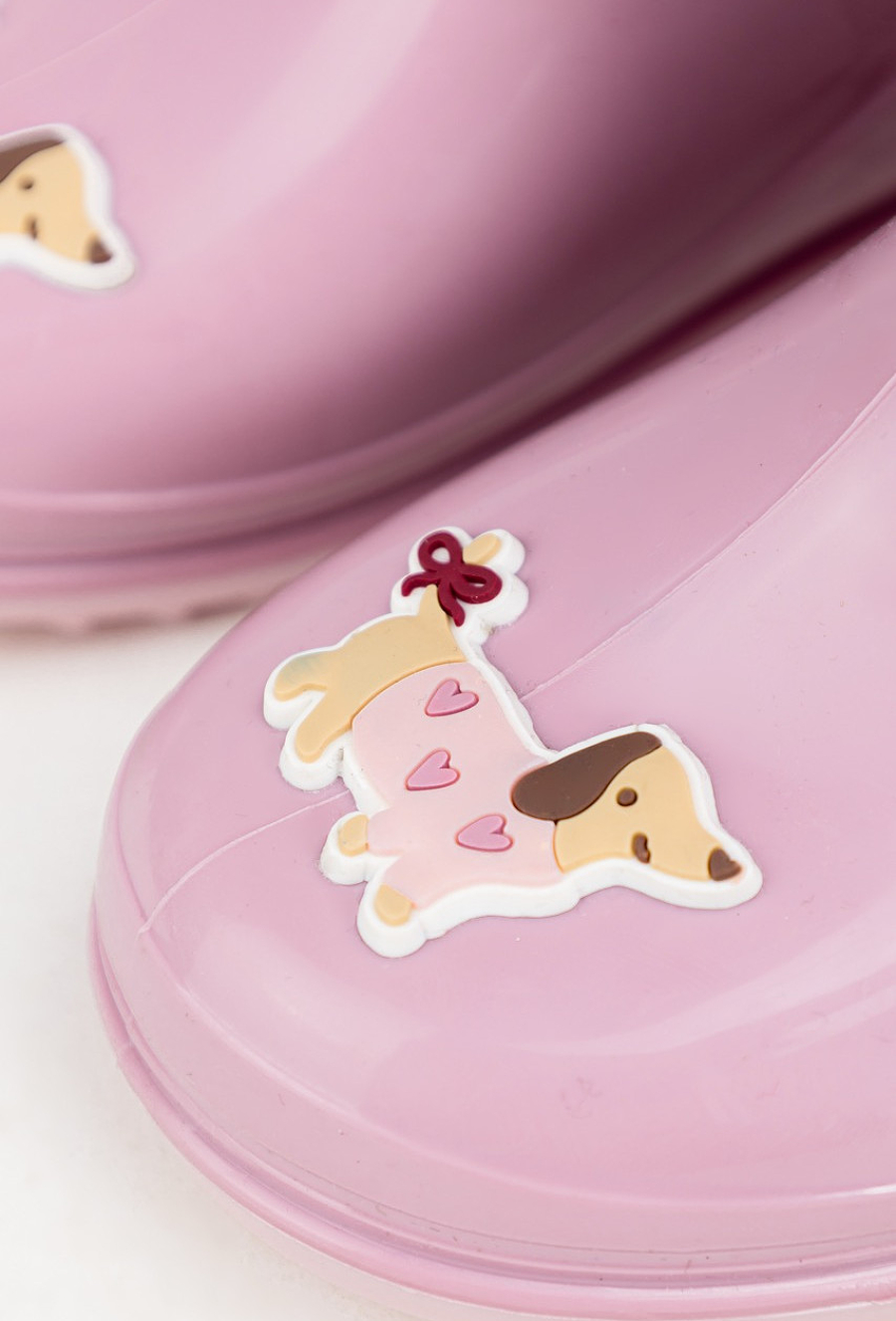 Różowe kalosze dziecięce z miękką, wyjmowaną i ocieplaną wkładką, idealne na jesienne i wiosenne spacery. Kalosze ozdobione aplikacją słodkiego pieska oraz kokardką. 100% materiał syntetyczny, wygodna i elastyczna cholewka, antypoślizgowa podeszwa, łatwe do zakładania i czyszczenia.