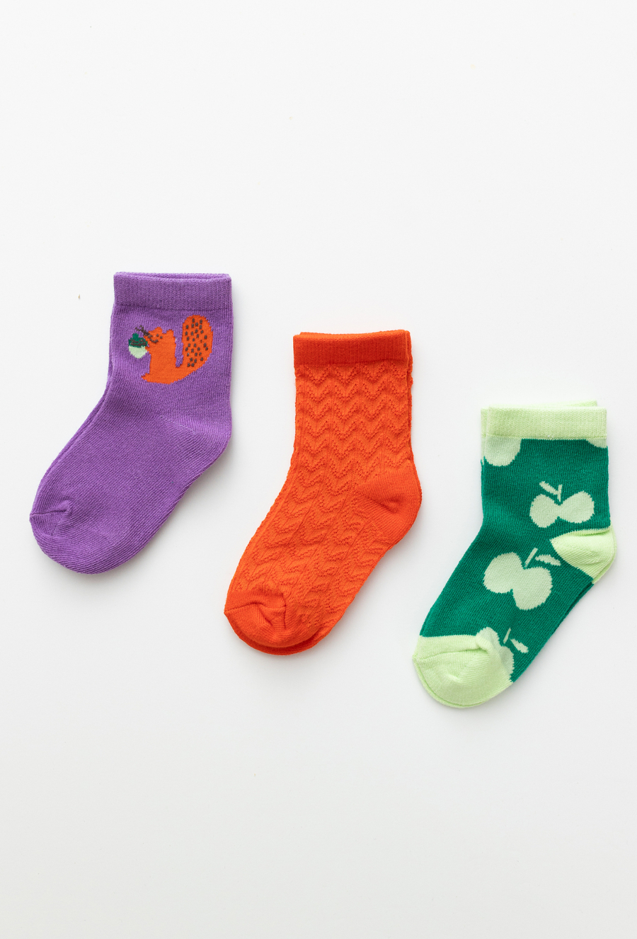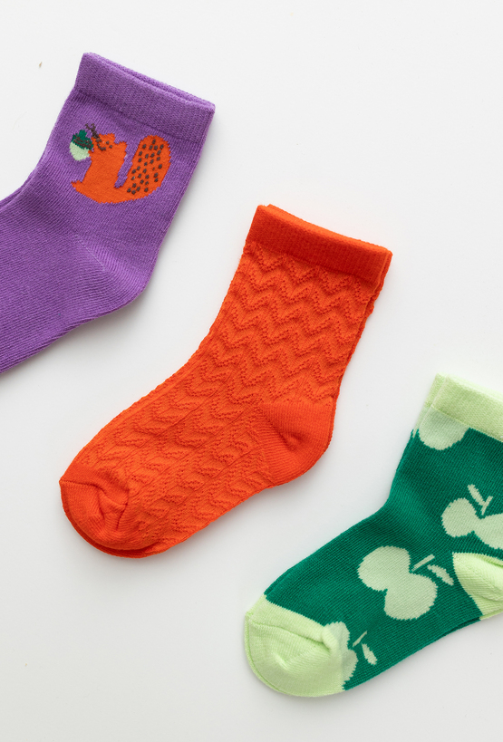 Barwny 3-pak skarpetek dziewczęcych to idealny sposób, by dodać dziecięcym stylizacjom energii i radości. W zestawie znajdują się trzy różne wzory: fioletowe skarpetki z uroczą wiewiórką, pomarańczowa para z dekoracyjną strukturą oraz zielone skarpetki z motywem jabłek. Miękki, elastyczny materiał gwarantuje komfort noszenia przez cały dzień – zarówno w szkole, przedszkolu, jak i podczas codziennych zabaw. Kolorowe skarpetki świetnie uzupełnią każdą stylizację i sprawią, że każdy dzień będzie trochę bardziej wesoły!
