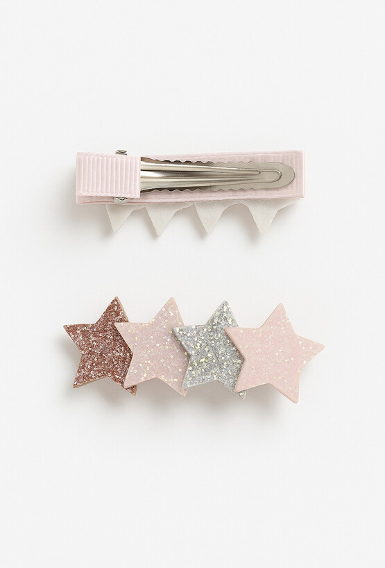 Zestaw dwóch spinek do włosów w kształcie gwiazdek to dodatek, który doda blasku każdej dziecięcej stylizacji. Spinki wykonane są z połyskującego materiału pokrytego drobnym brokatem w kolorach różu, złota i srebra. Delikatny uchwyt nie ciągnie włosów i jest bezpieczny dla dzieci. Idealne zarówno na co dzień, jak i do ozdobienia fryzury na uroczystości.