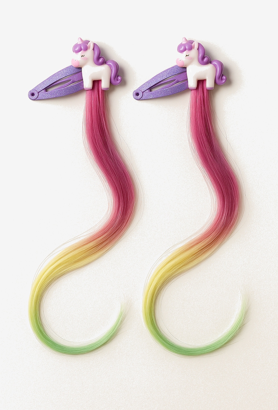 Kolorowe spinki z doczepianymi pasemkami to idealny sposób, aby dodać fryzurze odrobiny magii! W zestawie znajdują się dwie spinki ozdobione uroczym jednorożcem oraz długimi pasemkami w tęczowych odcieniach. Spinki łatwo się zapinają, świetnie trzymają we włosach i są wygodne w noszeniu – idealne na co dzień, do przedszkola, na zabawę czy tematyczne przyjęcia. Bajkowy motyw jednorożca i tęczowe kolory sprawiają, że każda mała miłośniczka fantastycznych dodatków poczuje się wyjątkowo.