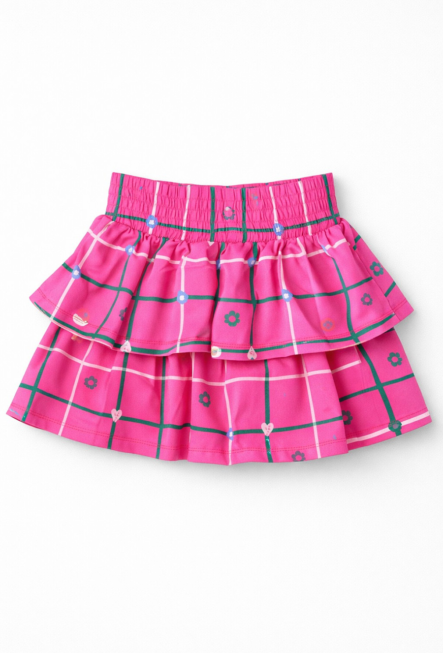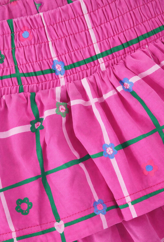 Ta krótka spódnica to idealny wybór dla dziewczynek, które lubią wyróżniać się kolorem i oryginalnymi wzorami. Intensywny odcień różu stanowi doskonałą bazę dla wielokolorowego, radosnego nadruku, który przyciąga wzrok. Całość powierzchni pokryta jest dynamicznym nadrukiem łączącym grubszą zieloną kratkę z mniejszymi, rozsypanymi kwiatuszkami w odcieniach błękitu i różu. Ten nietuzinkowy miks nadaje spódnicy wakacyjnego i nieco retro charakteru. Prosty, rozkloszowany krój sprawia, że spódnica pięknie układa się na sylwetce i jest niezwykle wygodna w noszeniu. Wykonana z miękkiego, przyjaznego dla skóry materiału, spódnica świetnie komponuje się zarówno z prostymi t-shirtami typu basic, jak i letnimi bluzkami na ramiączkach.