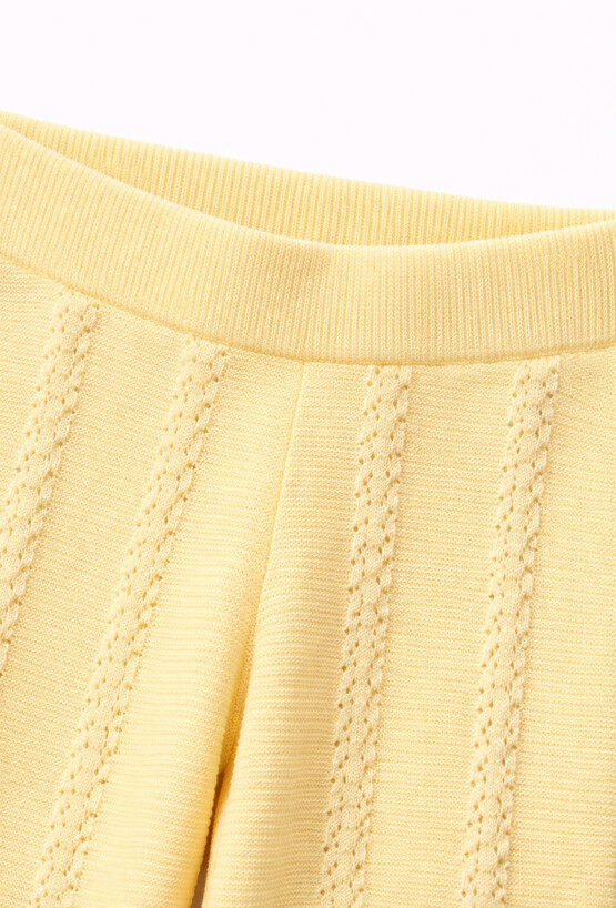 Te dziewczęce spodnie to idealne połączenie komfortu i subtelnego stylu. Model wykonany został w całości z naturalnej, przewiewnej bawełny, co zapewnia wygodę podczas noszenia. Spodnie wyróżniają się modnym krojem typu flare, który pięknie układa się na sylwetce. Ażurowy wzór dodaje całości lekkości, a ozdobna falbanka wykończająca dół nogawek nadaje im dziewczęcego charakteru.