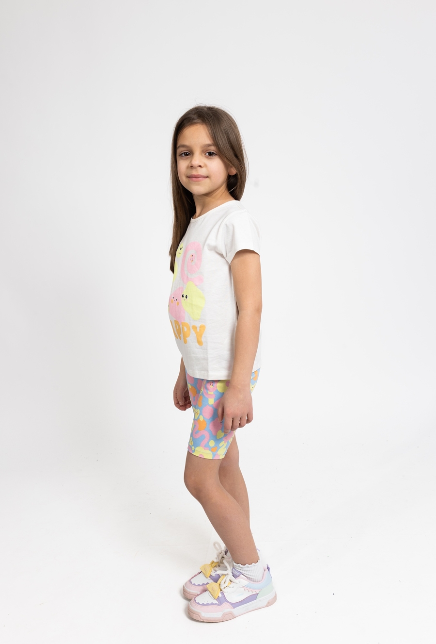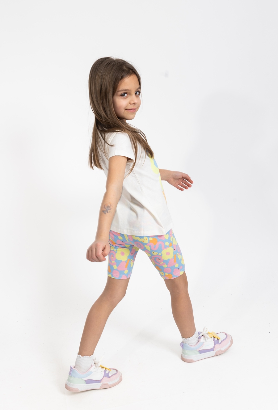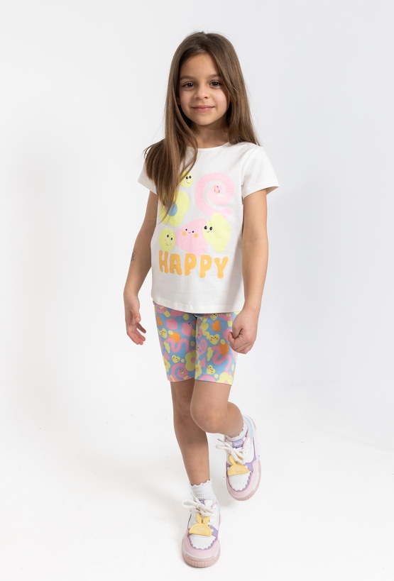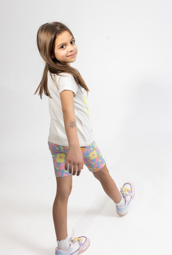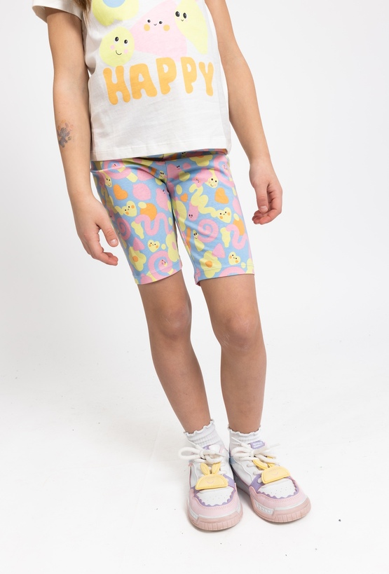 Te wygodne legginsy o długości 1/2 to doskonały wybór na aktywne dni, łączący praktyczny fason z pełnym energii designem. Utrzymane w przyjemnym, niebieskim kolorze, zostały w całości pokryte wesołym, kolorowym nadrukiem, który dodaje stylizacji letniego charakteru. Wykonane z elastycznego materiału, legginsy świetnie dopasowują się do sylwetki, zapewniając dziecku pełną swobodę podczas zabaw na świeżym powietrzu czy wakacyjnych wyjazdów. To modna i uniwersalna propozycja, która idealnie uzupełni każdą codzienną stylizację, świetnie prezentując się w zestawieniu z ulubionymi t-shirtami czy tunikami.