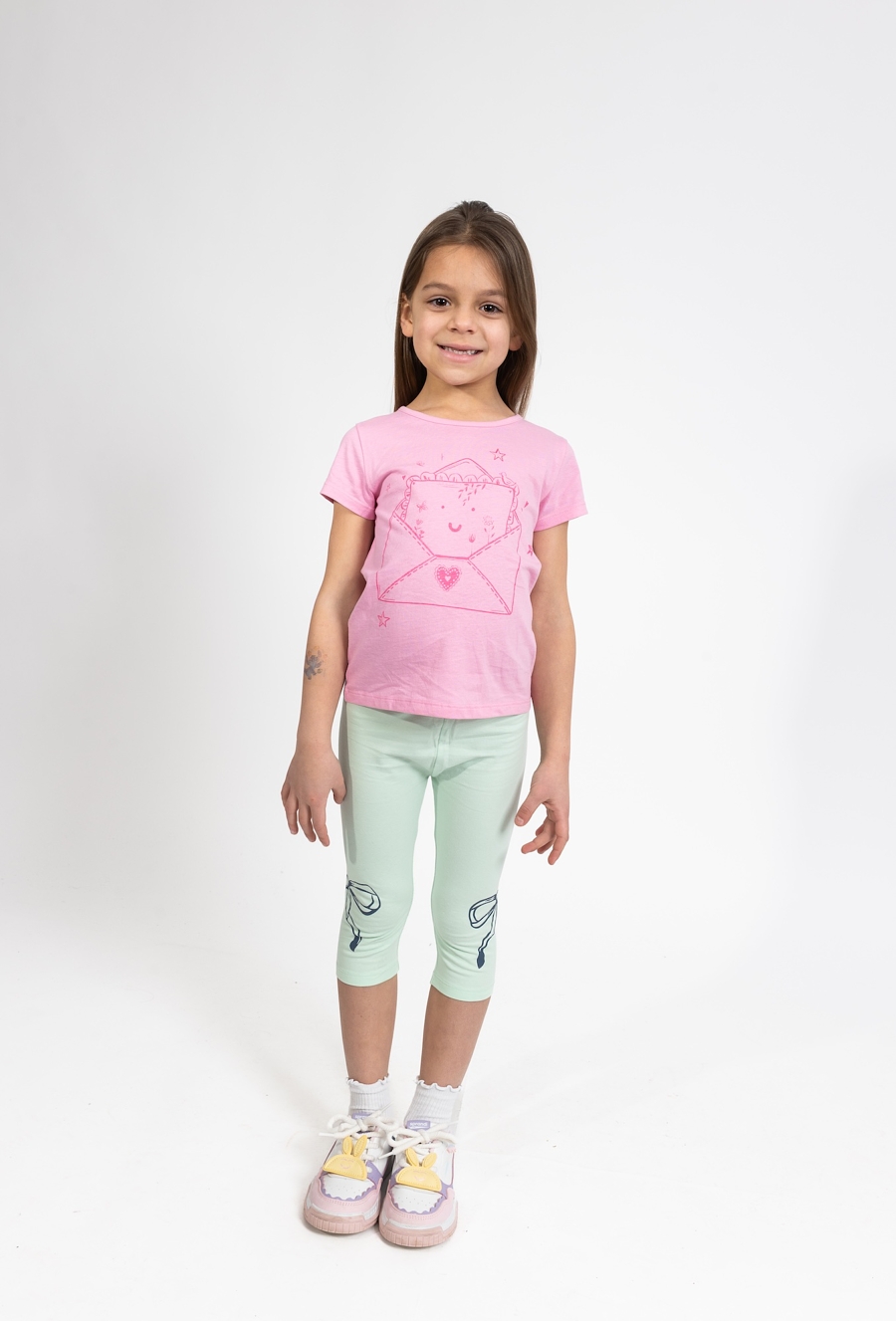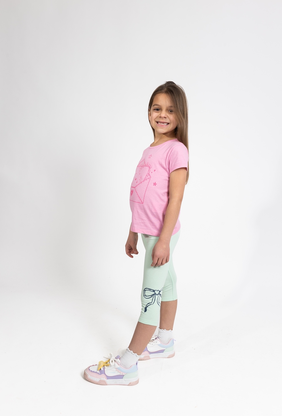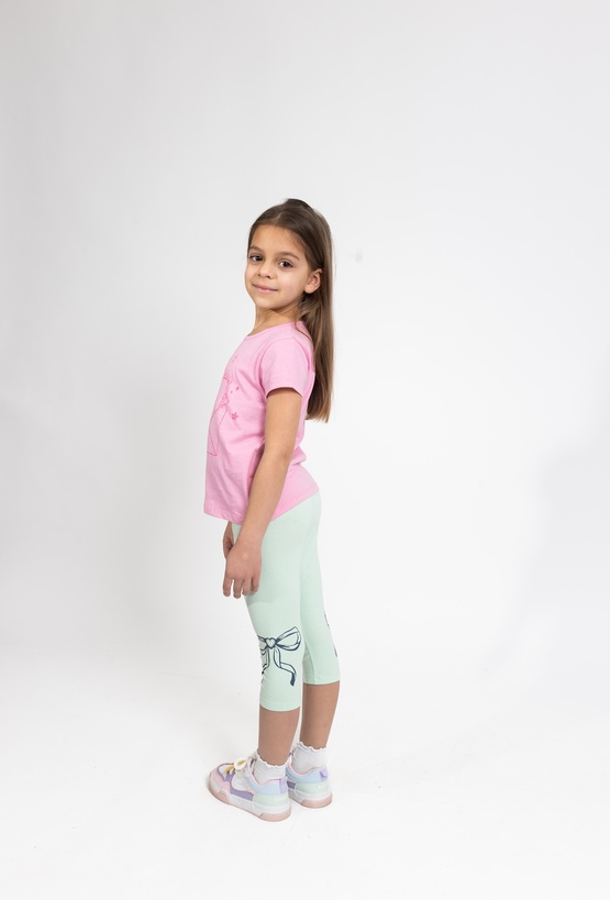 Wygodne i elastyczne legginsy to niezastąpiony element dziewczęcej garderoby, idealny na cieplejsze dni. Model wykonano z połączenia bawełny oraz elastanu, co zapewnia doskonałe dopasowanie do sylwetki oraz pełną swobodę ruchów podczas zabawy. Legginsy mają praktyczną długość 3/4. Całość zdobi dziewczęcy nadruk przedstawiający drobne kokardki umieszczone na nogawkach, który dodaje modelowi wyjątkowego uroku. Dzięki elastycznemu pasowi, legginsy są łatwe do założenia i bardzo komfortowe w codziennym użytkowaniu.