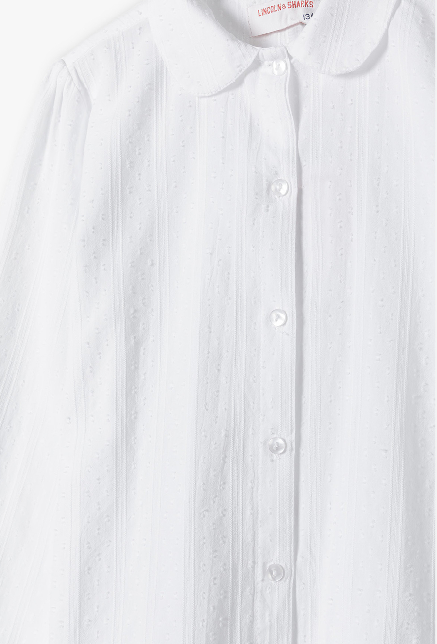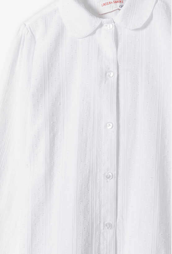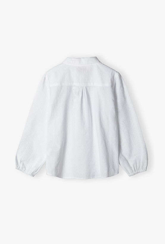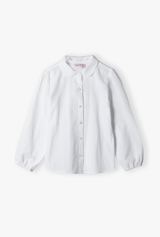 Szukasz bazy do wizytowych stylizacji swojej córki? Ta śnieżnobiała koszula to połączenie ponadczasowej klasyki z subtelnymi, nowoczesnymi detalami. Dzięki delikatnej fakturze materiału i starannemu wykończeniu, bluzka doskonale sprawdzi się podczas apeli szkolnych, rodzinnych uroczystości czy świątecznych spotkań. Materiał koszuli zdobią delikatne, pionowe prążki oraz drobne, wypukłe kropeczki. Ten szlachetny detal nadaje bluzce lekkości i elegancji, odróżniając ją od klasycznych, gładkich koszul. Klasyczny, zaokrąglony kołnierzyk dodaje stylizacji miękkości i dziewczęcego szyku, idealnie komponując się z rozpinanymi sweterkami lub marynarkami. Przód bluzki zdobi rząd estetycznych, perłowych guzików, które ułatwiają zakładanie i stanowią subtelną ozdobę.