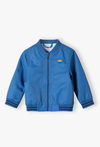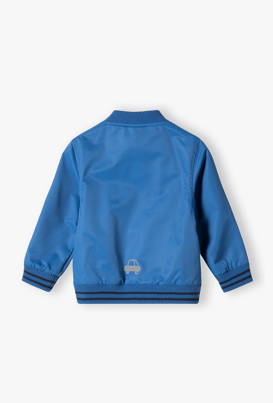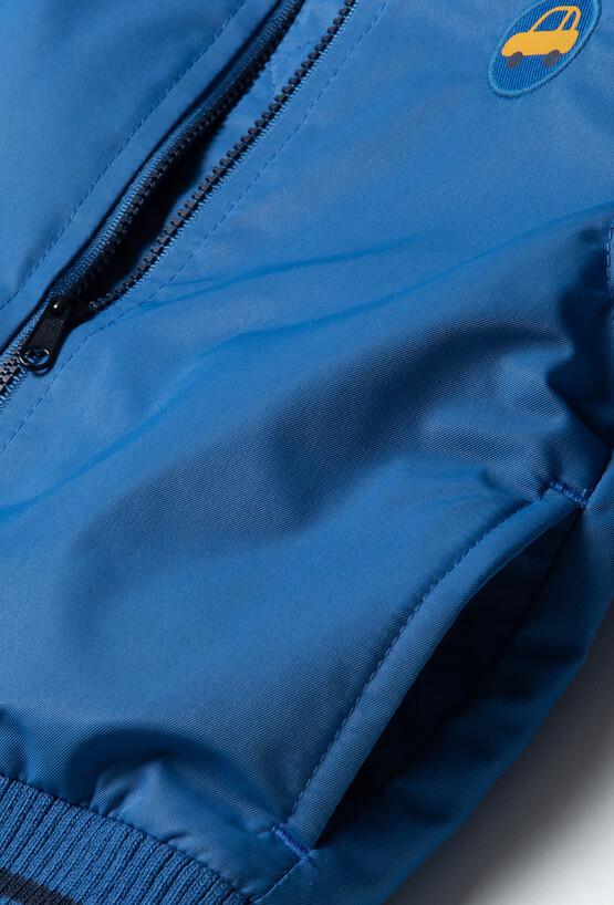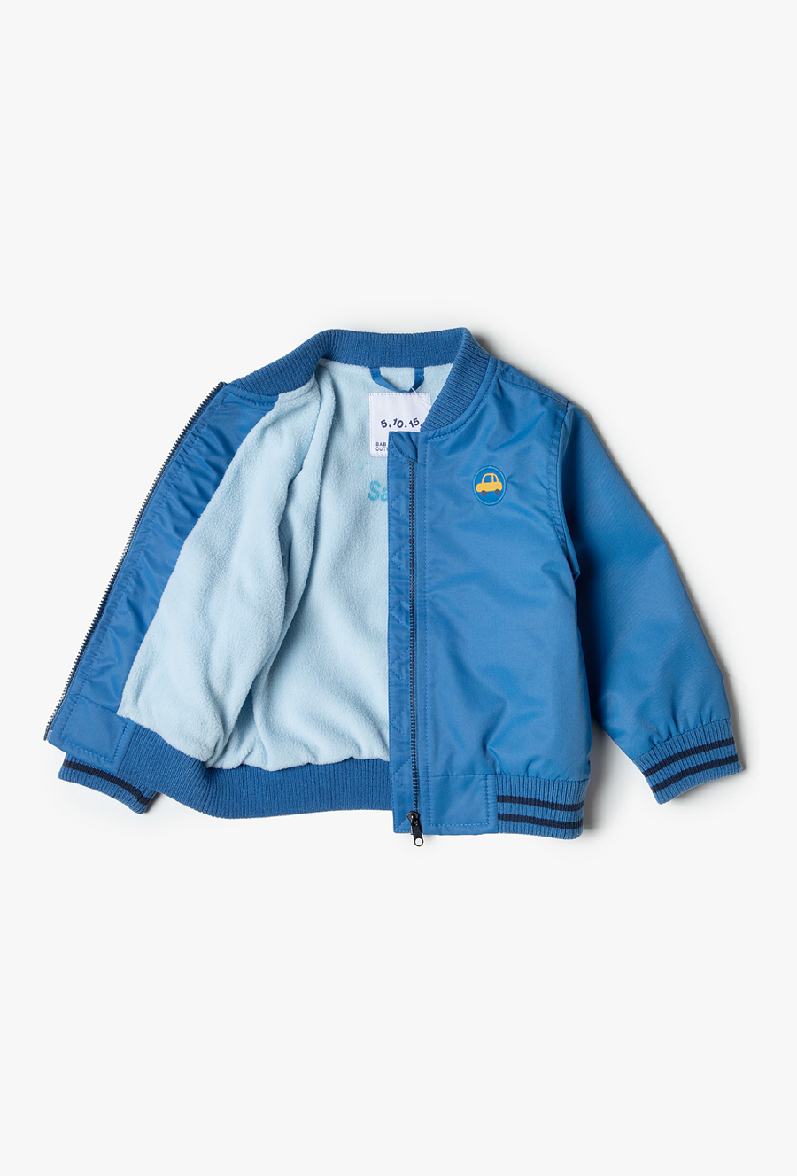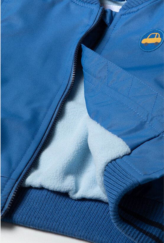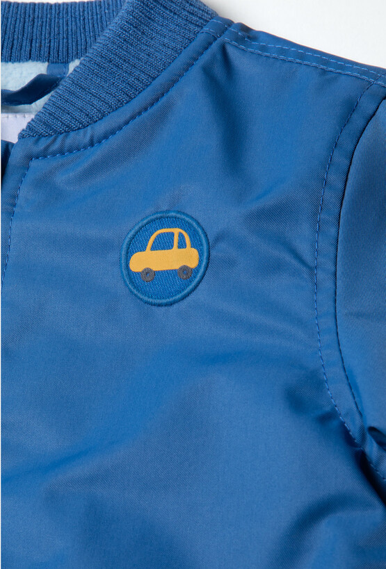 Przygotuj swojego małego odkrywcę na pierwsze wiosenne spacery w wielkim stylu! Ta niebieska kurtka przejściowa o fasonie klasycznej bomberki to idealne połączenie modnego wyglądu i funkcjonalności. Zapewnia ochronę przed wiatrem, jednocześnie dbając o to, by maluszkowi było miękko i przytulnie. Wnętrze kurtki zostało wyłożone błękitnym, miękkim polarem. To dodatkowa warstwa izolacji, która skutecznie chroni przed chłodem w zmienne, wiosenne dni. Na przodzie znajduje się okrągła aplikacja z żółtym samochodem. Ten radosny, chłopięcy detal przyciąga wzrok i nadaje kurtce dziecięcego uroku.
