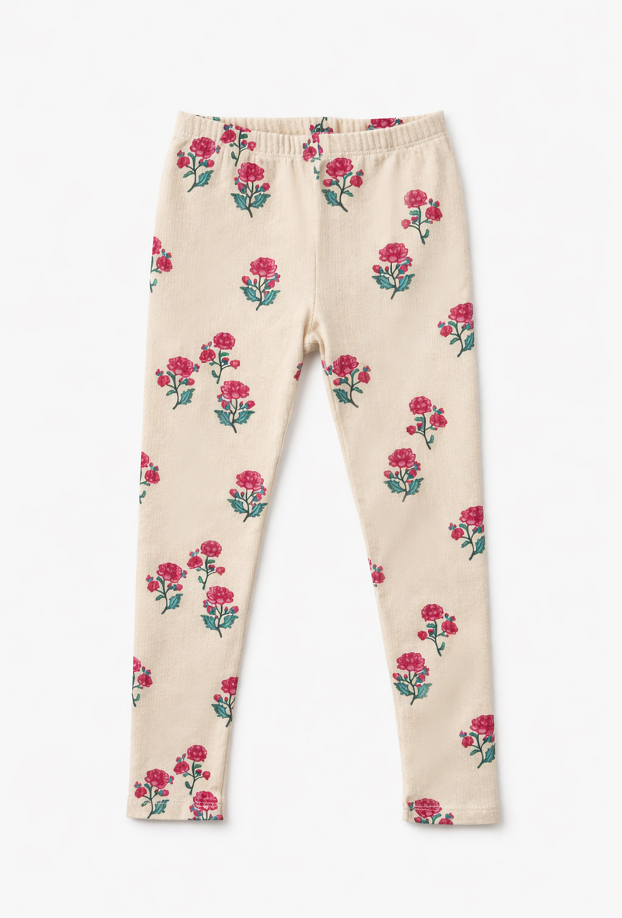 Urocze legginsy dziewczęce w kolorze ecru z kwiatowym printem w róże. Uszyte z prążkowanej dzianiny rib (95% bawełna, 5% elastan), są miękkie, elastyczne i świetnie dopasowują się do sylwetki, nie krępując ruchów. Idealne do przedszkola, na spacer i na co dzień – pasują zarówno do tunik, jak i t-shirtów czy bluz.
