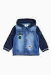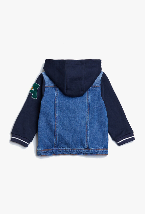 Szukasz okrycia wierzchniego, które nada Twojemu dziecku wyjątkowy wygląd, a jednocześnie nie ograniczy jego swobody? Ta kurtka typu bomberka to modowe połączenie klasycznego jeansu z miękkością bluzy dresowej. Zainspirowana stylem uniwersyteckim, idealnie sprawdzi się podczas wiosennych i jesiennych spacerów. Korpus kurtki został wykonany z jasnego, przecieranego jeansu, natomiast rękawy oraz kaptur to miękka dzianina dresowa w kolorze głębokiego granatu. To połączenie gwarantuje stylowy wygląd przy zachowaniu maksymalnego komfortu noszenia. Zintegrowany kaptur chroni główkę malucha przed wiatrem i lekkim deszczem.
