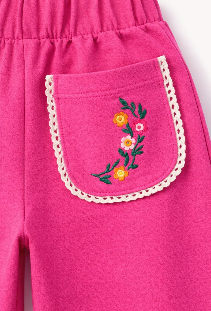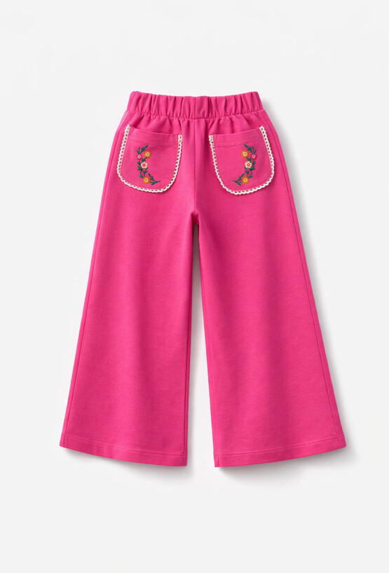 Różowe spodnie wide leg dla dziewczynki to połączenie wygody i uroczego detalu. Uszyte z grubszej, mięsistej dzianiny (95% bawełna, 5% elastan) są miękkie, elastyczne i świetnie układają się na sylwetce. Szerokie nogawki dają swobodę ruchów, a elastyczna gumka w pasie zapewnia komfort przez cały dzień. Uwagę przyciągają dekoracyjne kieszonki wykończone koronką i haftem w kwiatuszki – idealne do stylizacji na co dzień i na wyjątkowe wyjścia.