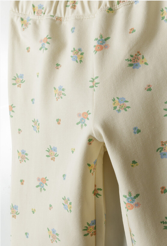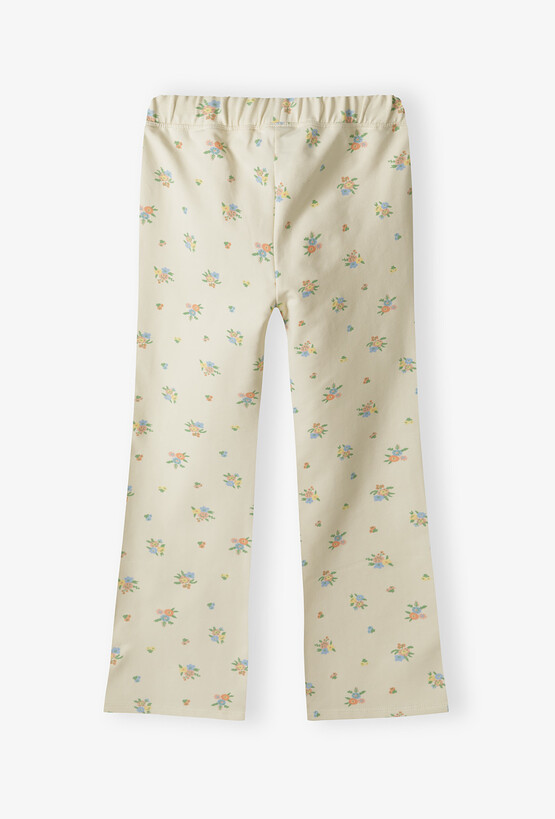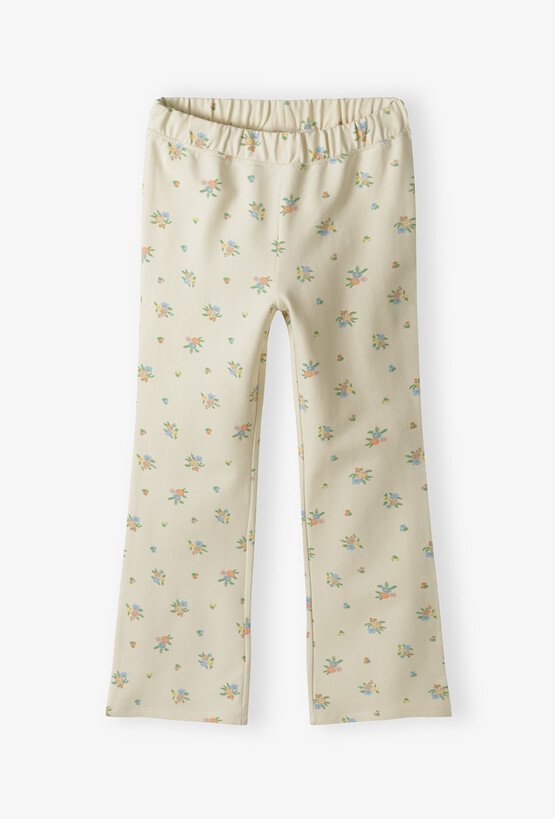 Postaw na najgorętszy trend sezonu w uroczej, dziecięcej odsłonie! Te kremowe spodnie o fasonie dzwonów (flare) to idealne połączenie stylu vintage z komfortem, którego potrzebuje każda mała odkrywczyni. Delikatny kwiatowy wzór nadaje im wyjątkowego, wiosennego charakteru. Rozszerzane ku dołowi nogawki to absolutny hit, który pięknie prezentuje się w ruchu i nadaje stylizacji nowoczesnego sznytu. Spodnie są dopasowane w biodrach i udach, co zapewnia zgrabny wygląd. Na jasnym, kremowym tle rozmieszczone są gęsto drobne bukieciki kwiatów w odcieniach błękitu, pomarańczu i zieleni. To subtelny wzór, który łatwo dopasować do wielu górnych części garderoby.