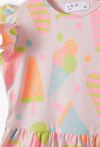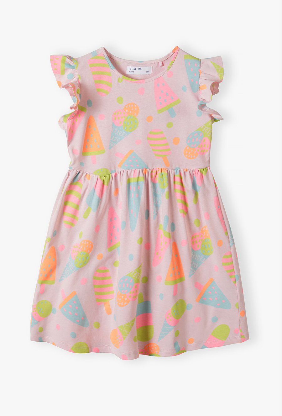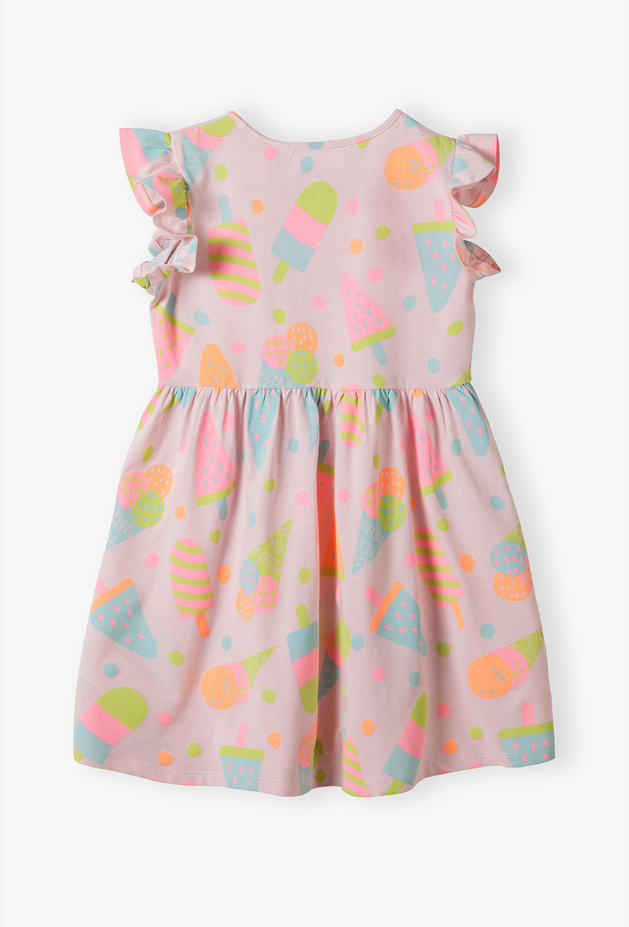 Podaruj swojej córeczce stylizację pełną radosnej energii! Ta różowa sukienka bez rękawów to kwintesencja wakacyjnej zabawy. Dzięki soczystym kolorom i urokliwym detalom, każda mała miłośniczka słodkości poczuje się w niej wyjątkowo podczas letnich spacerów, przyjęć w ogrodzie czy wakacyjnych wyjazdów. Cała powierzchnia sukienki pokryta jest kolorowym nadrukiem lodów w rożkach i na patyku w neonowych odcieniach pomarańczu, zieleni i fioletu. To wzór, który od razu przywołuje wakacyjny nastrój. Zamiast klasycznych rękawków, sukienka posiada urocze, marszczone falbanki przy ramionach, które nadają całości lekkości i wyjątkowego wdzięku.
