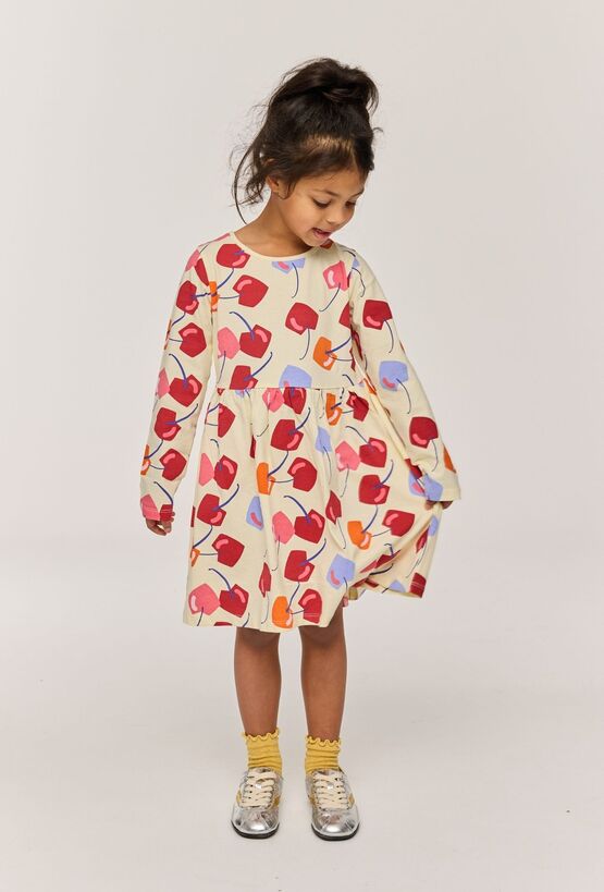 Dziewczęca sukienka z długim rękawem w kolorze beżowym z uroczym, miękkim nadrukiem w czereśnie na całym produkcie. Wykonana z 100% bawełny, jest przyjemna dla skóry i wygodna w noszeniu. Luźniejszy, codzienny fason sprawdzi się do przedszkola, na spacer i na rodzinne wyjścia – wystarczy dobrać rajstopy lub legginsy i gotowe.