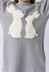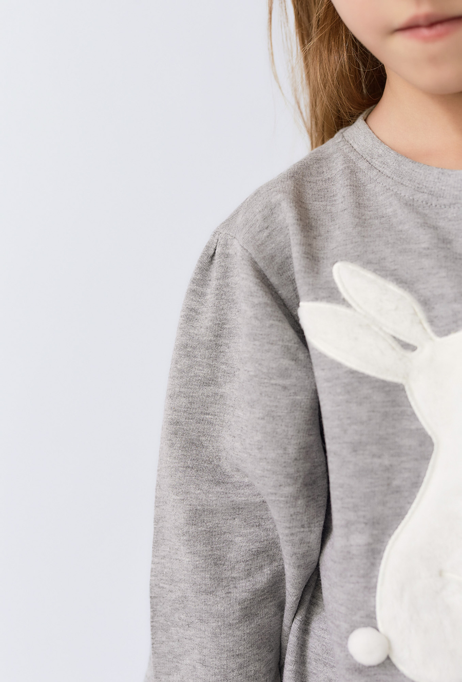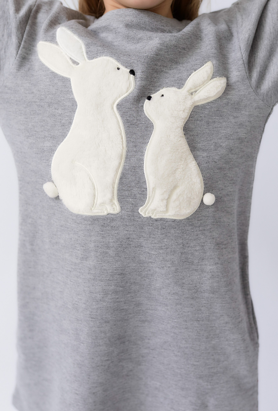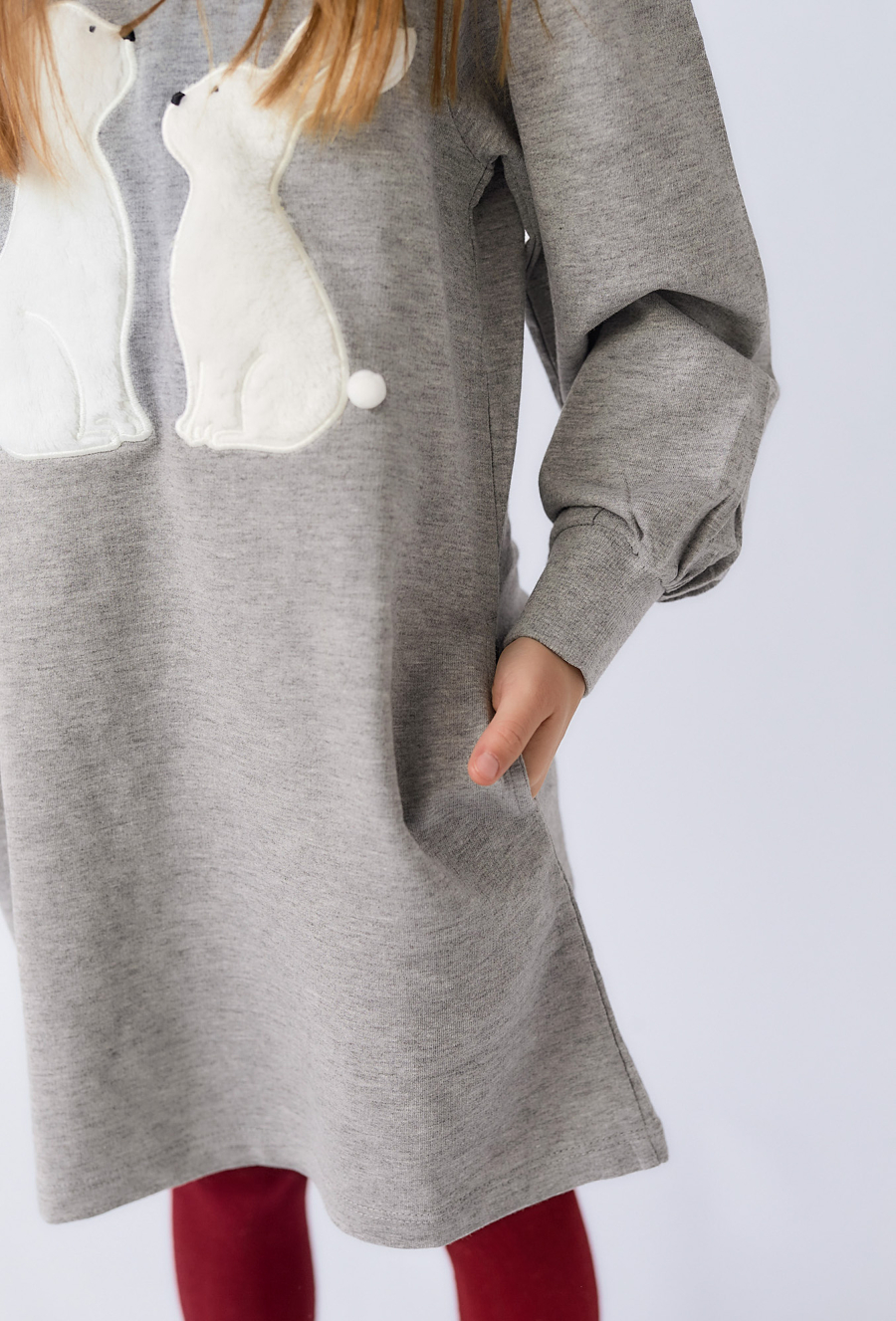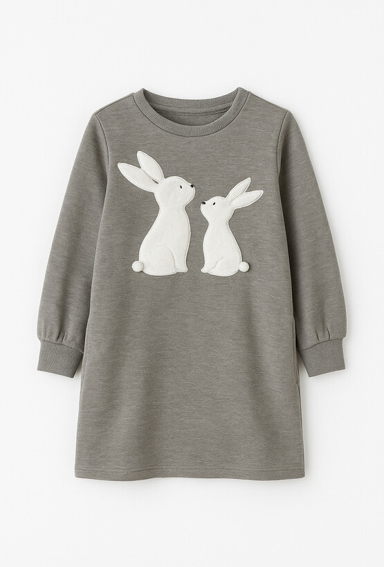 Wyjątkowo urocza sukienka dziewczęca z długim rękawem to idealna propozycja na chłodniejsze dni. Wykonana z miękkiej i ciepłej dzianiny bawełniano-wiskozowej, zapewnia komfort noszenia i swobodę ruchów. Na froncie znajduje się przytulna aplikacja dwóch królików z pluszowym ogonkiem – detal, który zachwyci każdą małą miłośniczkę zwierzątek!. Rękawy zakończone ściągaczami nadają całości lekkiego, sportowego charakteru.