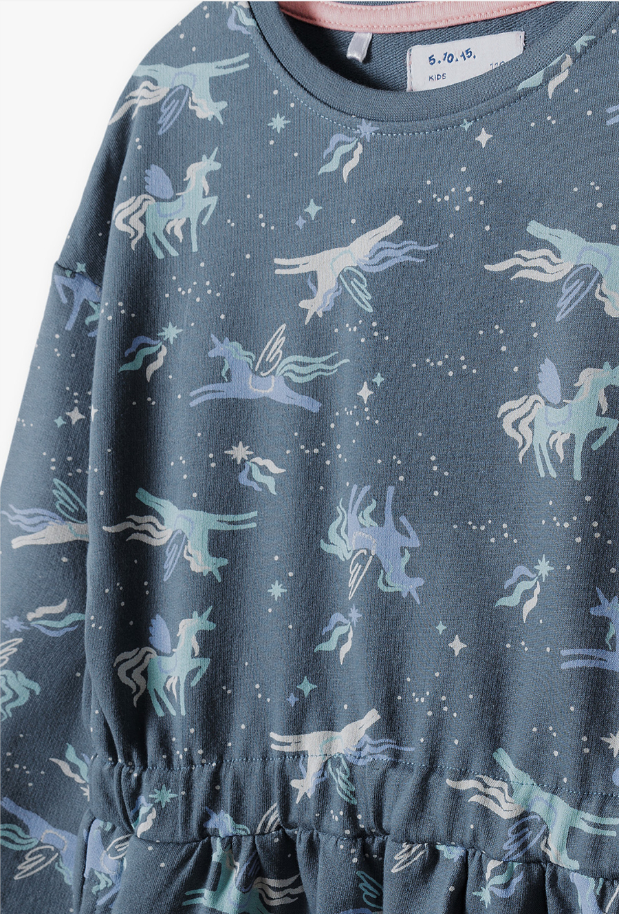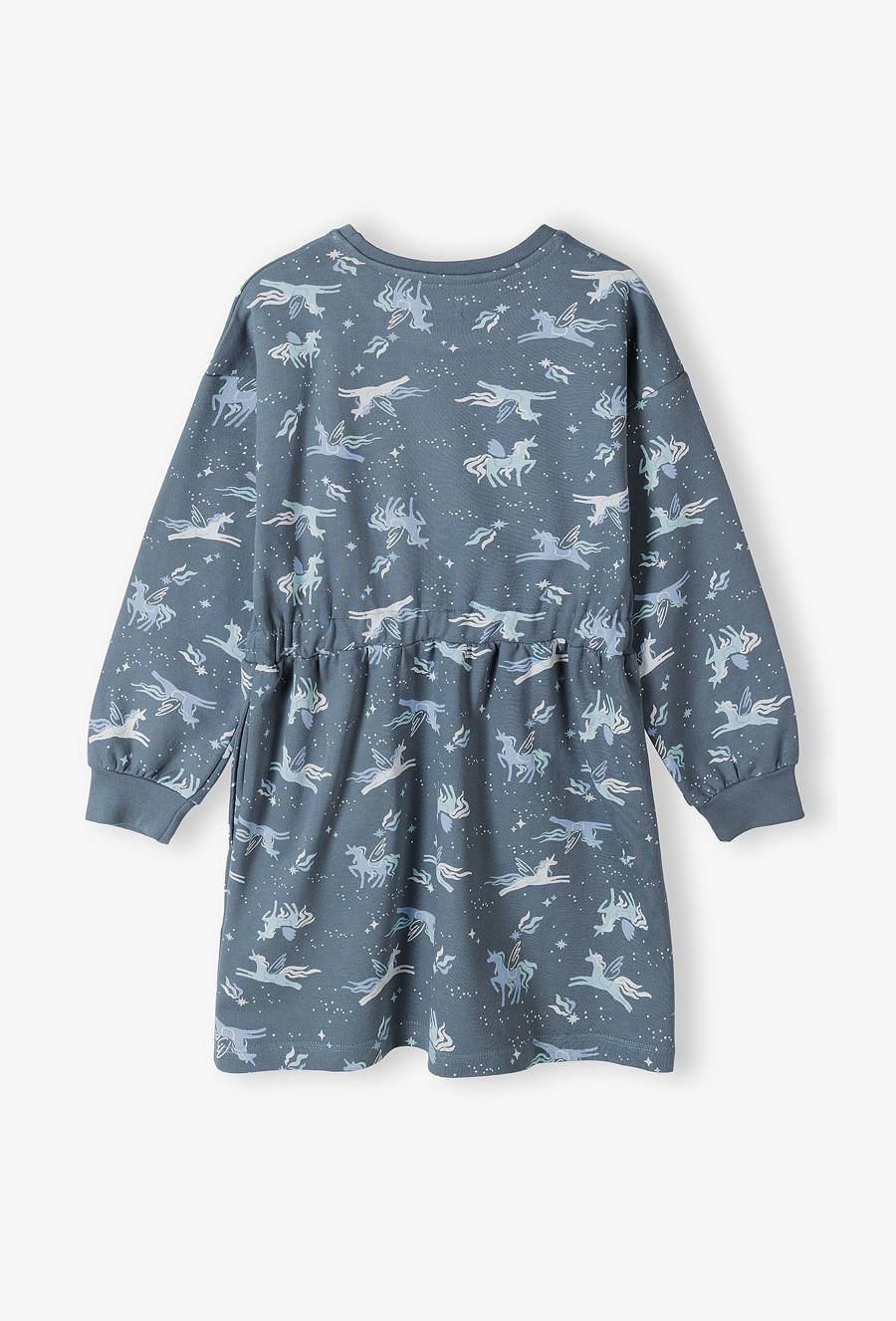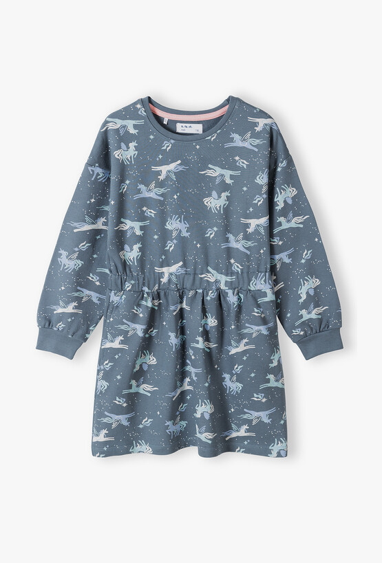 Podaruj swojej córeczce odrobinę magii na co dzień! Ta sukienka to idealne połączenie dziewczęcego wdzięku z komfortem ulubionej bluzy. Głęboki odcień przygaszonego błękitu oraz uroczy print sprawiają, że jest to doskonały wybór zarówno do przedszkola, jak i na weekendowe przyjęcia. Cała powierzchnia materiału pokryta jest nadrukiem skrzydlatych jednorożców (pegazów) w otoczeniu gwiazd i komet. To wzór, który pokocha każda mała marzycielka. Elastyczne marszczenie w talii nie tylko nadaje sukience ładny kształt, ale przede wszystkim pozwala na idealne dopasowanie do sylwetki bez ograniczania swobody ruchów. Długie rękawy zakończone są miękkimi ściągaczami, dzięki czemu nie podwijają się podczas zabawy.