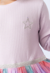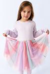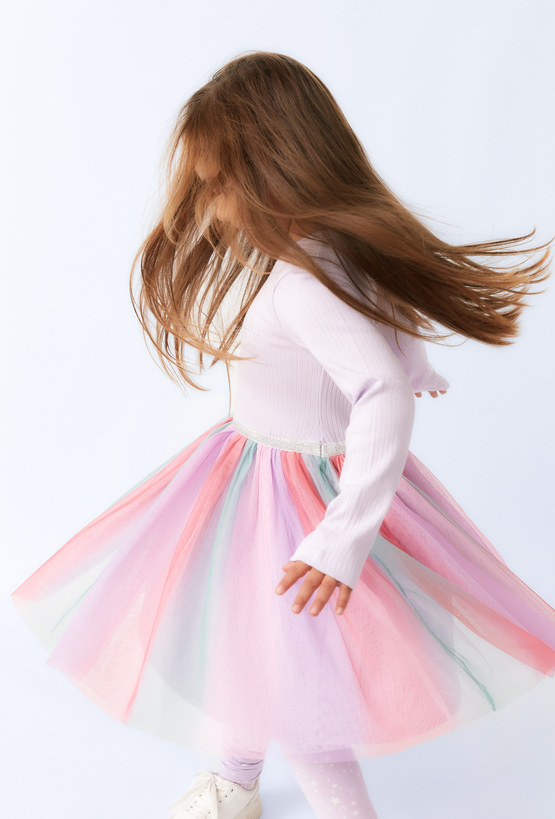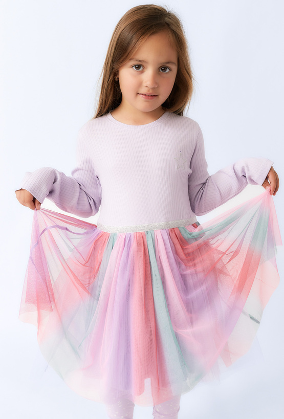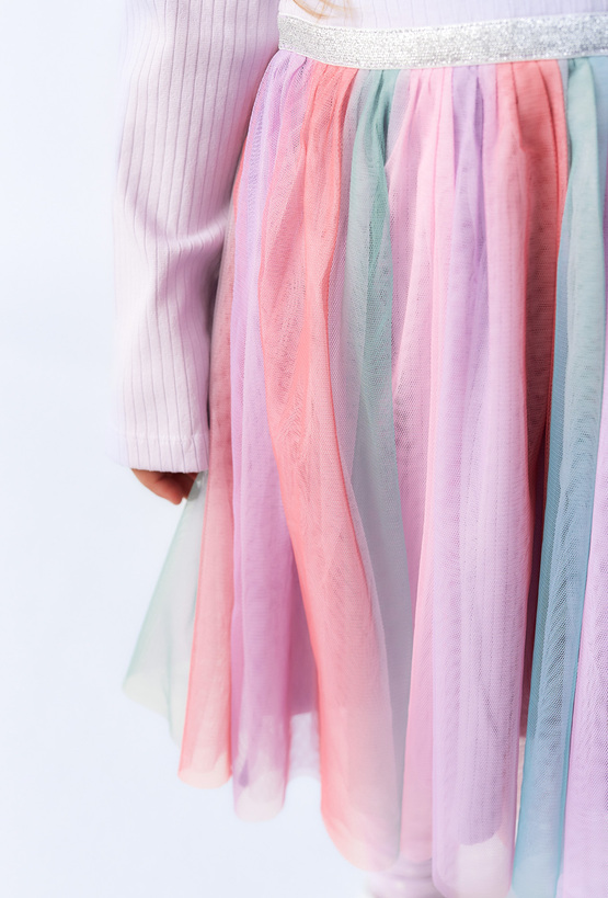 Sukienka z długim rękawem dla dziewczynki, która łączy wygodę i bajkowy styl. Miękka dzianina w kolorze lawendowym z delikatnym prążkowaniem, wielowarstwowy tiul w pastelowych odcieniach różu, fioletu, mięty i błękitu. Ozdobna, błyszcząca gumka zapewniająca wygodne dopasowanie. Ta bajkowa sukienka to doskonały wybór na urodziny, przyjęcia, święta czy inne wyjątkowe okazje. Łączy dziewczęcy urok z komfortem noszenia.