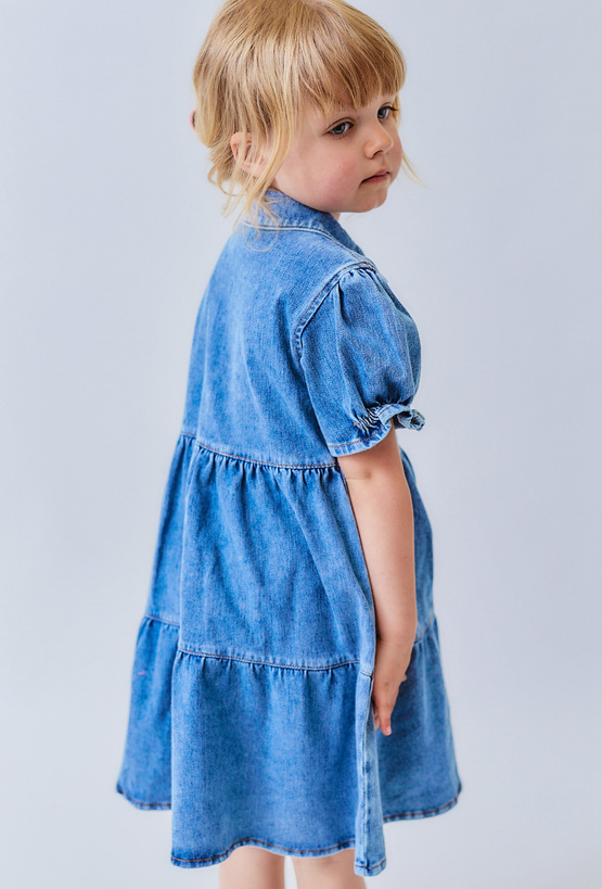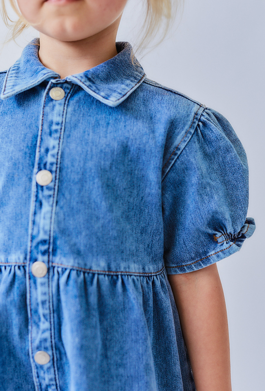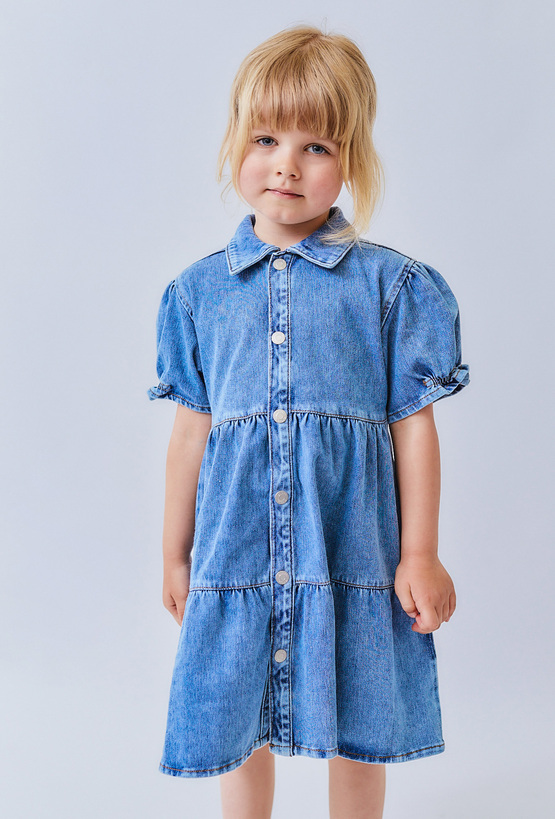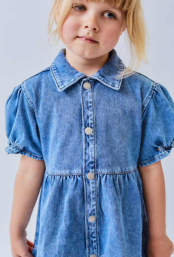 Sukienka jeansowa dla dziewczynki z krótkim rękawem to połączenie wygody i ponadczasowego stylu. Zapinana z przodu na praktyczne napy ułatwiające zakładanie. Delikatnie marszczone rękawki dodają dziewczęcego uroku a rozkloszowany krój z przeszyciami tworzy lekką i swobodną formę.