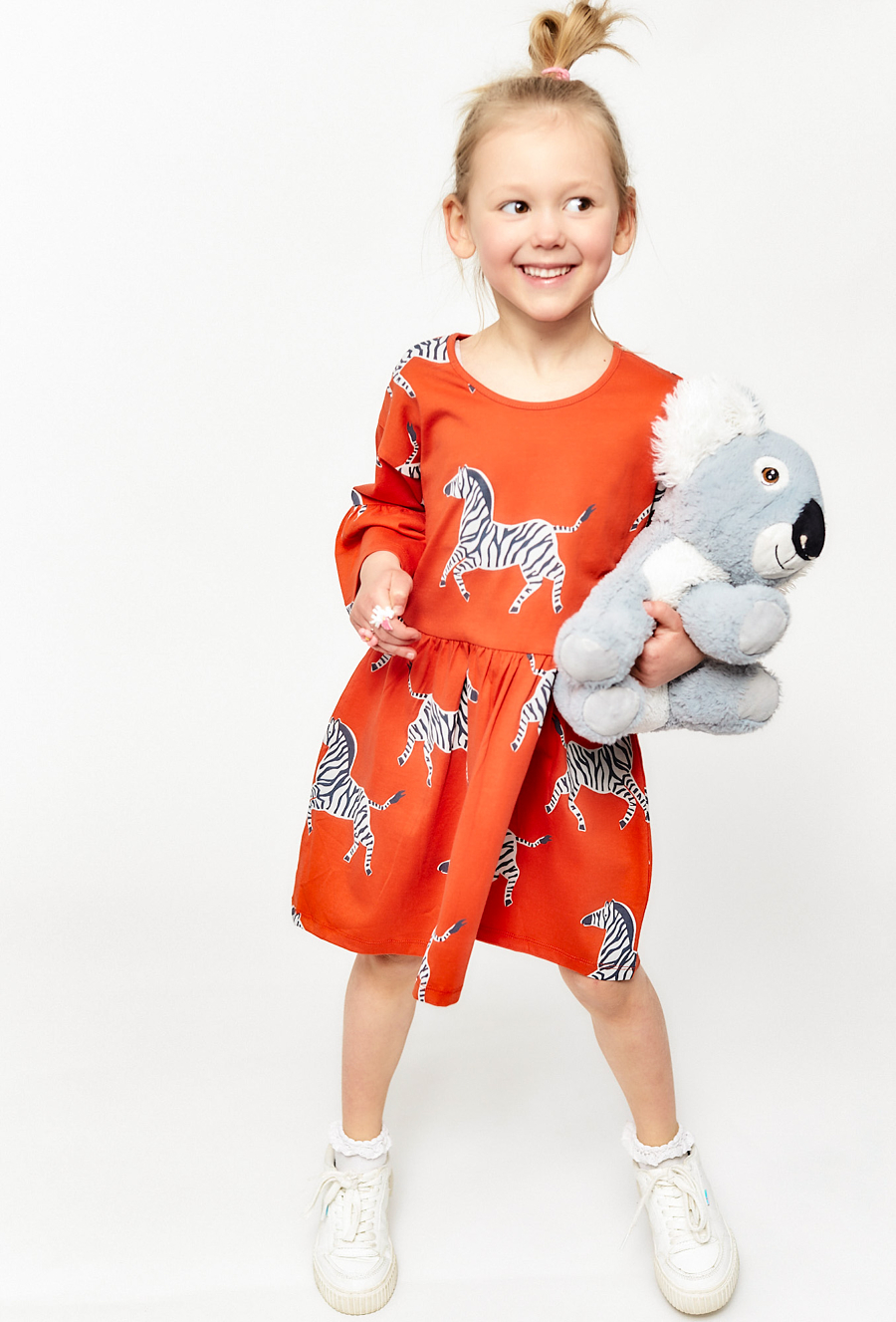 Wyrazista sukienka w kolorze pomarańczowym z dużymi nadrukami zebr to propozycja dla dziewczynek, które lubią energiczne wzory i swobodny krój. Model z rękawami ¾ i delikatnym marszczeniem w pasie dobrze układa się na sylwetce i daje dużo swobody podczas zabawy. Lekko rozkloszowany dół i miękka dzianina sprawiają, że sukienka będzie chętnie wybierana zarówno na co dzień, jak i na specjalniejsze wyjścia.