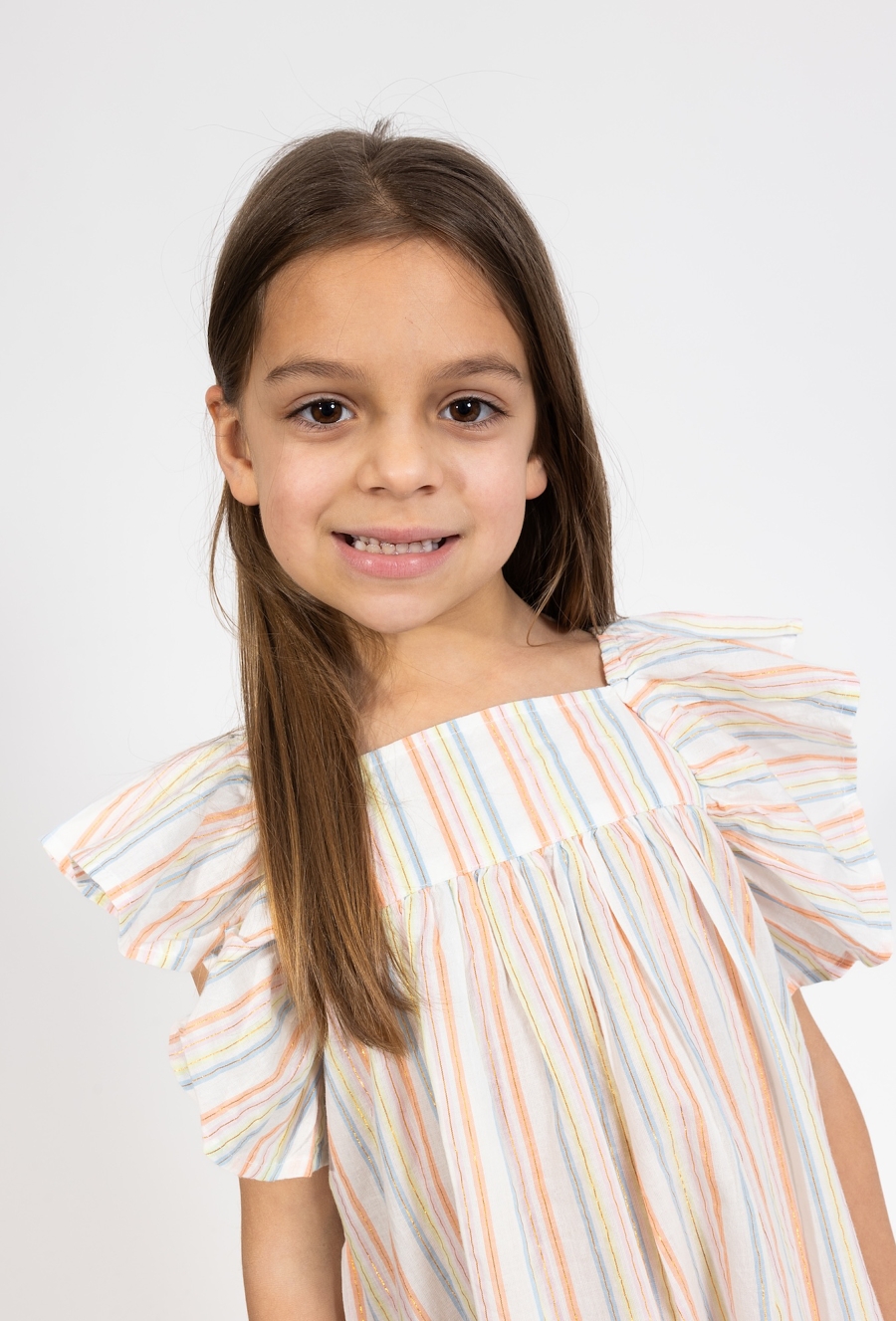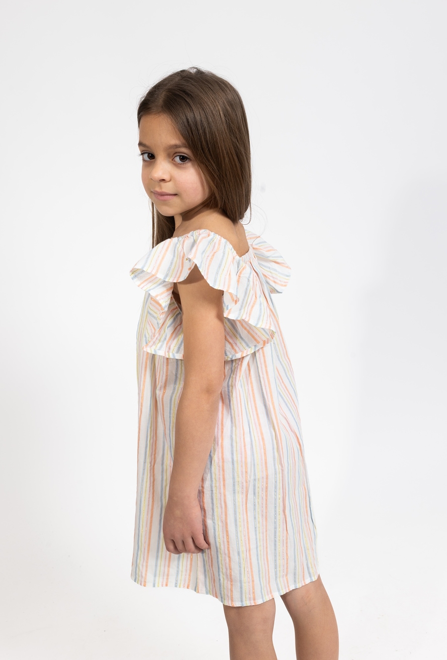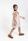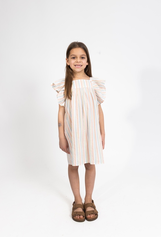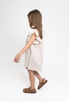 Ta wyjątkowa sukienka to idealna propozycja dla dziewczynki, która lubi łączyć elegancję z wakacyjną swobodą. Model posiada modny fason bez rękawów z opuszczonymi ramionami typu "hiszpanka", co nadaje całości romantycznego i bardzo nowoczesnego charakteru. Beżowa baza sukienki została wzbogacona o efektowną tkaninę w kolorowe i metaliczne paski, które pięknie odbijają światło i przyciągają wzrok. Lekki, tkaninowy materiał zapewnia doskonałą przewiewność, co sprawia, że sukienka jest nie tylko piękna, ale również bardzo komfortowa w noszeniu nawet podczas gorących dni.