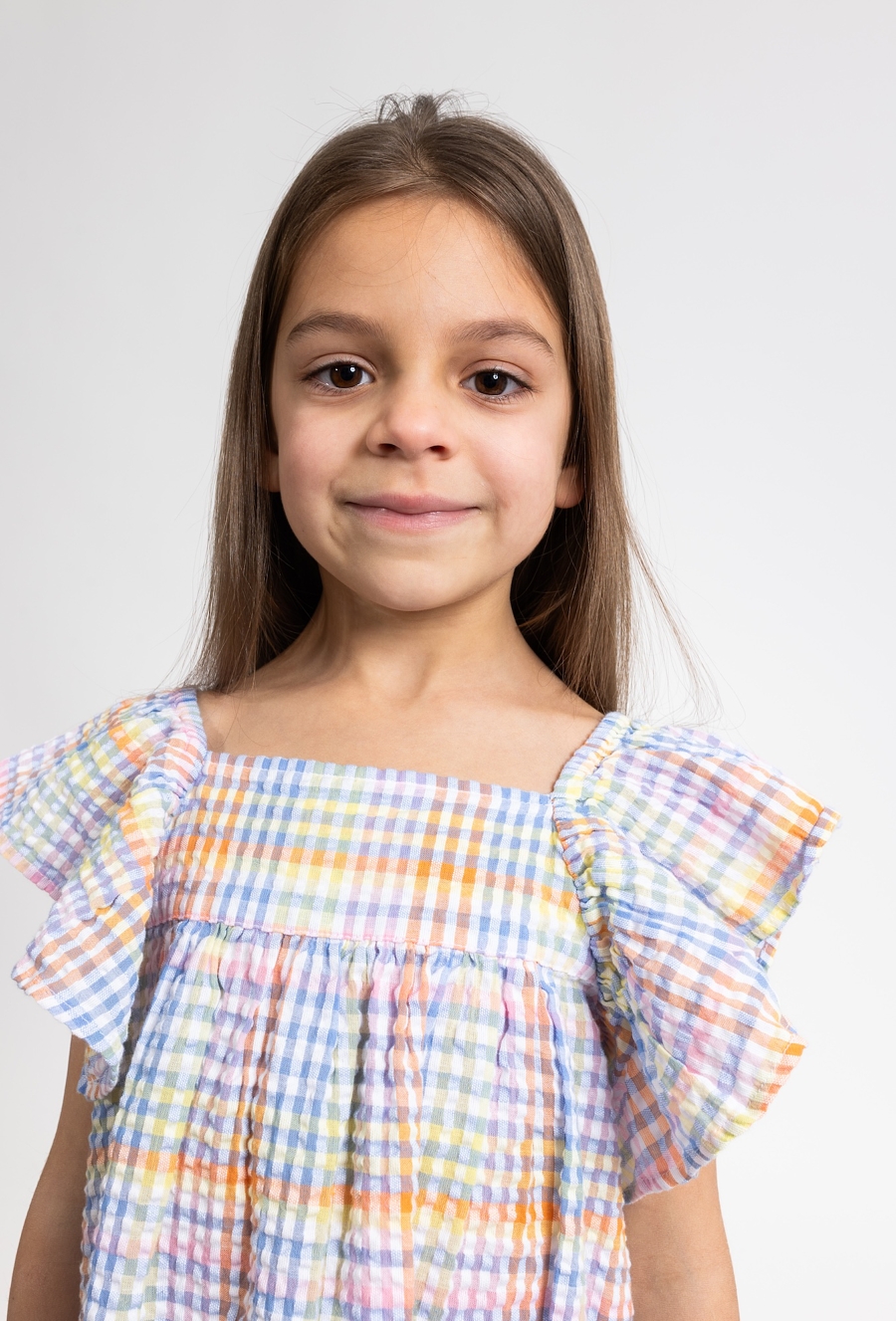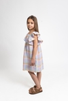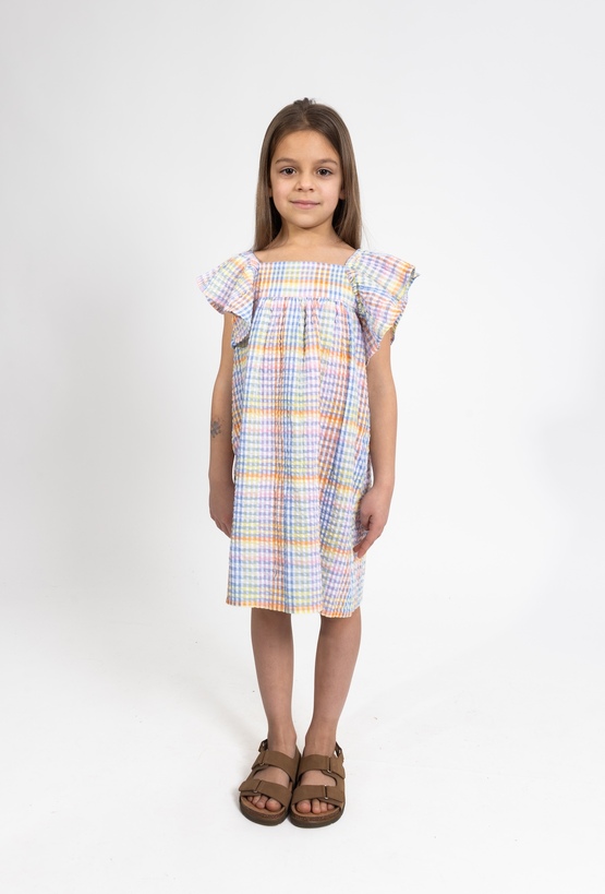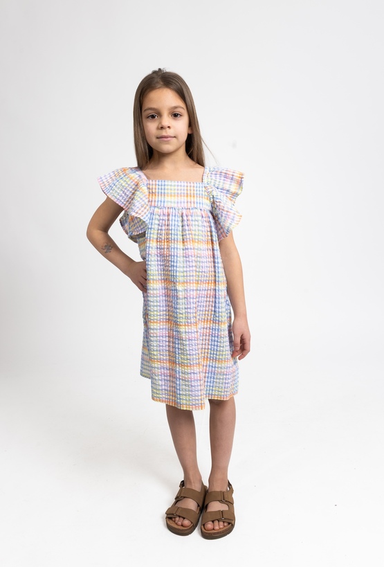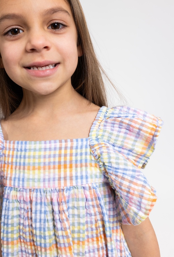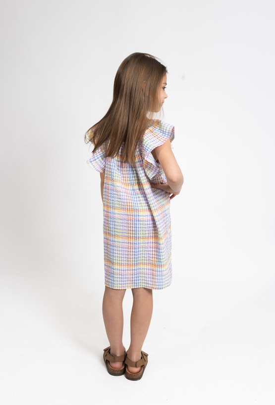 Ta urocza sukienka to idealna propozycja na ciepłe, letnie dni, łącząca modny fason z wysokim komfortem. Model został wykonany z bawełny gofrowanej, która wyróżnia się unikalną, delikatnie wypukłą strukturą materiału, zapewniającą doskonałą przewiewność. Sukienka posiada bezrękawnikowy fason z modnymi, opuszczonymi ramionami w stylu ala hiszpanka, co nadaje całości lekkości i dziewczęcego wdzięku. Całość zdobi wesoły wzór w kolorową kratkę utrzymany w ciepłej, pomarańczowej tonacji, która idealnie wpisuje się w wakacyjny klimat. To doskonały wybór na spacery, rodzinne wyjścia czy wakacyjne przygody.