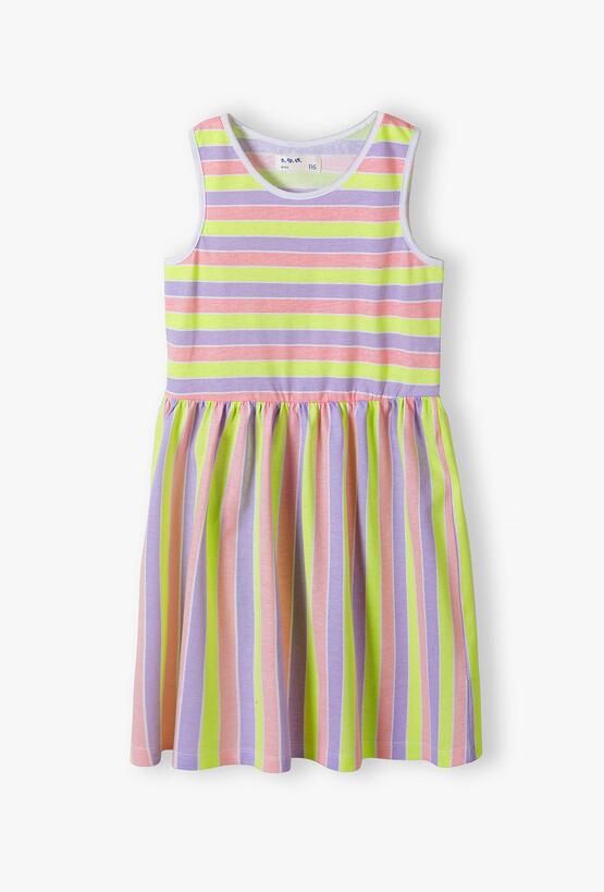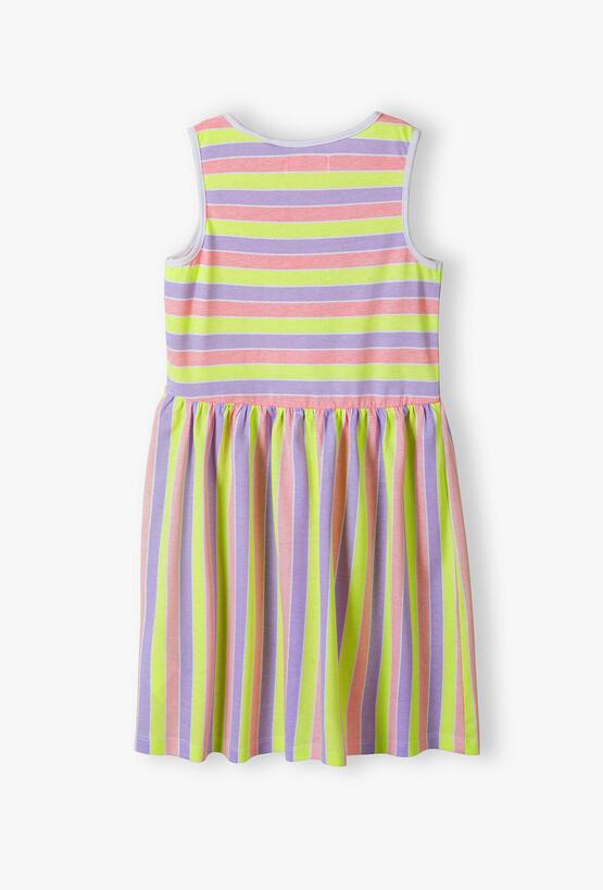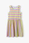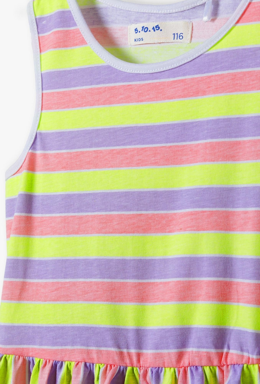 Podaruj swojej córeczce dawkę koloru na każdy słoneczny dzień! Ta sukienka bez rękawów to idealne połączenie wygody i najmodniejszych letnich trendów. Dzięki nasyconym barwom i lekkiemu fasonowi, sukienka ta będzie doskonałym wyborem na wakacyjne spacery, przyjęcia w ogrodzie czy codzienne zabawy na świeżym powietrzu. Połączenie neonowej limonki, pastelowego fioletu oraz radosnego koralu i różu tworzy niezwykle świeżą i nowoczesną kompozycję, która przyciąga wzrok i podkreśla dziecięcy optymizm. Zastosowanie poziomych pasków na górze oraz pionowych na spódnicy nadaje sukience unikalnego charakteru i optycznie urozmaica całą stylizację.