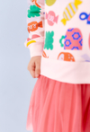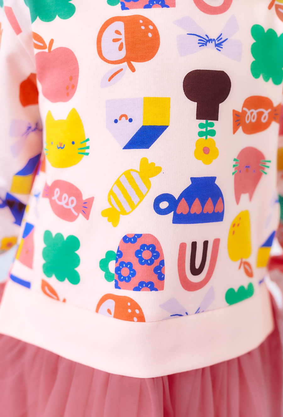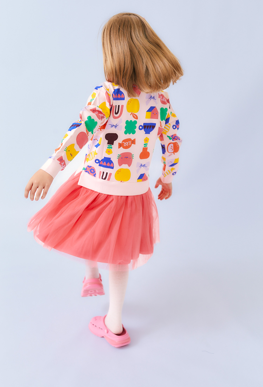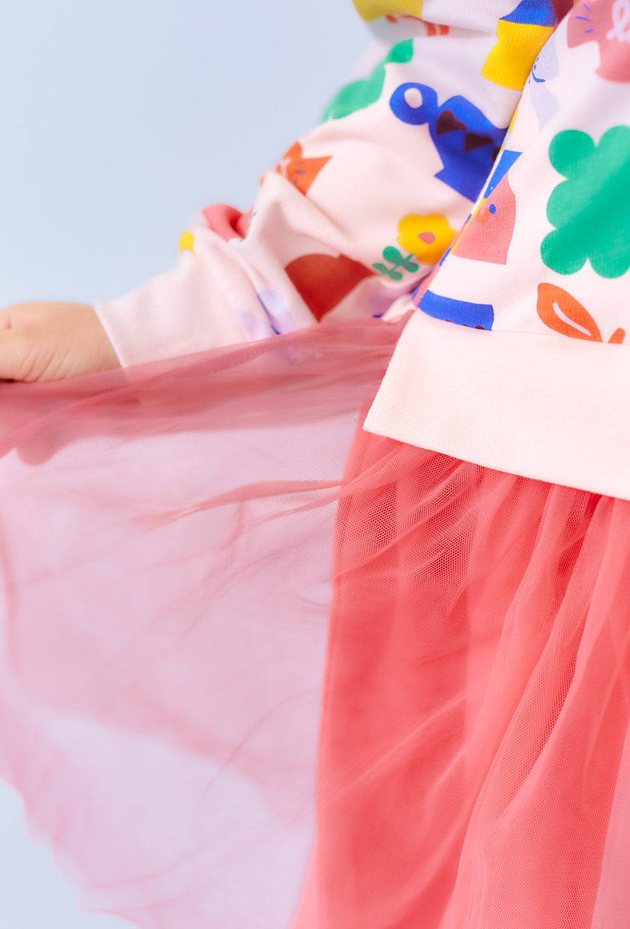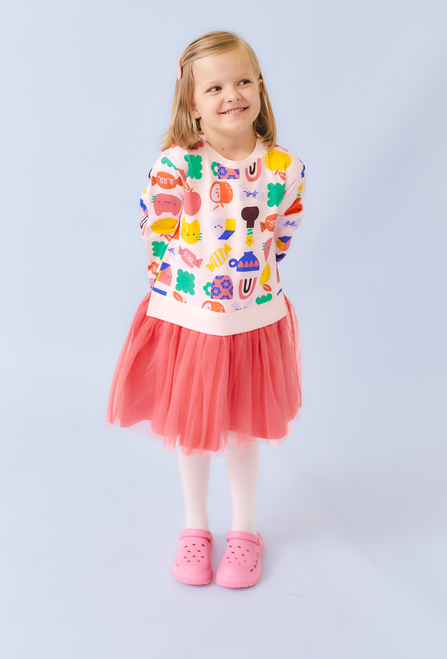 Ta sukienka z długim rękawem to gotowa stylizacja w jednej rzeczy! Góra z miękkiej dzianiny ma wesoły, wielokolorowy nadruk, a lekka tiulowa spódniczka dodaje całości dziewczęcego uroku. Świetnie sprawdzi się zarówno na co dzień do przedszkola, jak i na urodziny czy rodzinne wyjście.