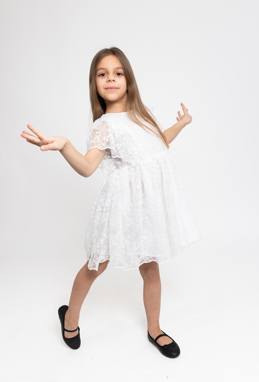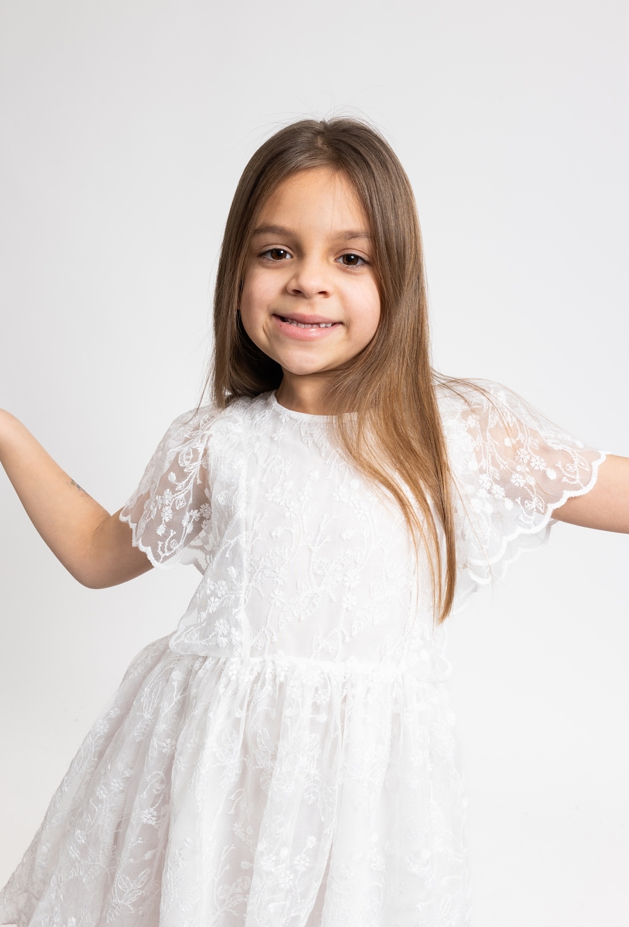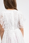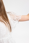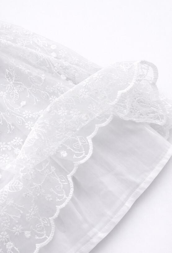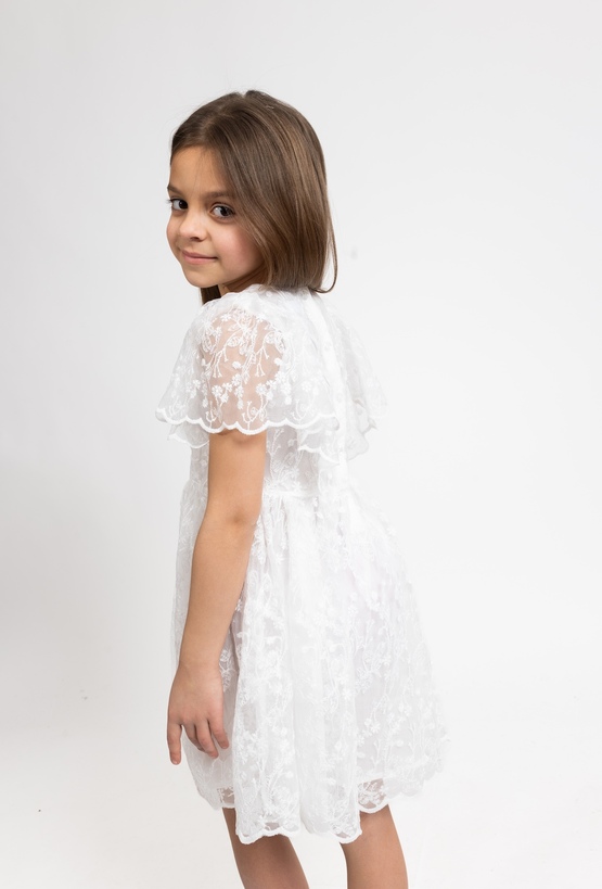 Wyjątkowa kreacja na specjalne okazje. Ta biała sukienka 51015 z krótkim rękawem zachwyca delikatnym, tiulowym materiałem zdobionym subtelnym, kwiatowym haftem. Wykonana z dbałością o detale, zapewnia dziewczynce elegancki wygląd przy zachowaniu pełnej swobody ruchów. Praktyczne zapięcie na guziki z tyłu ułatwia ubieranie, sprawiając, że sukienka jest nie tylko piękna, ale również wygodna podczas rodzinnych uroczystości czy ważnych wyjść.