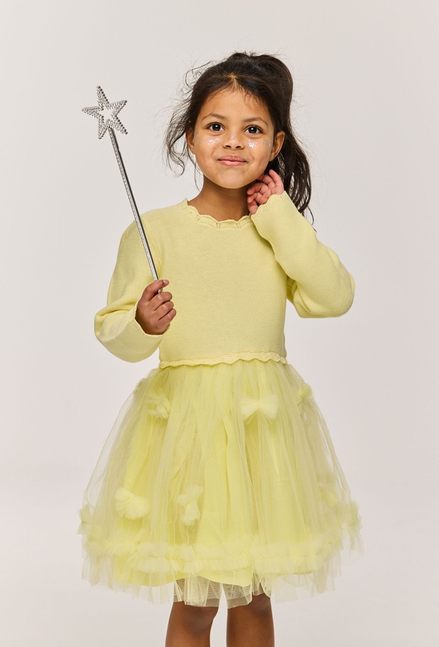 Wyjątkowa żółta sukienka z długim rękawem łączy wygodę dzianiny z lekkością tiulu – idealna na uroczystości, przyjęcia i wyjątkowe dni. Góra swetrowa wykonana w 100% z bawełny jest miękka i przyjemna dla skóry, a klasyczny krój zapewnia komfort noszenia przez cały dzień. Dół stanowi efektowna spódnica z tiulu, która pięknie układa się w ruchu i dodaje stylizacji bajkowego charakteru. Całość dopełniają ozdobne kokardki na spódnicy.