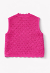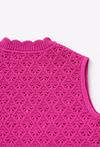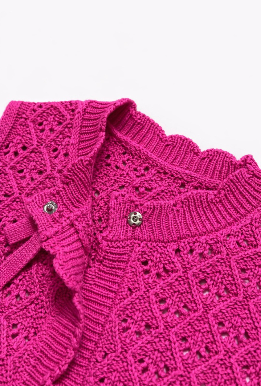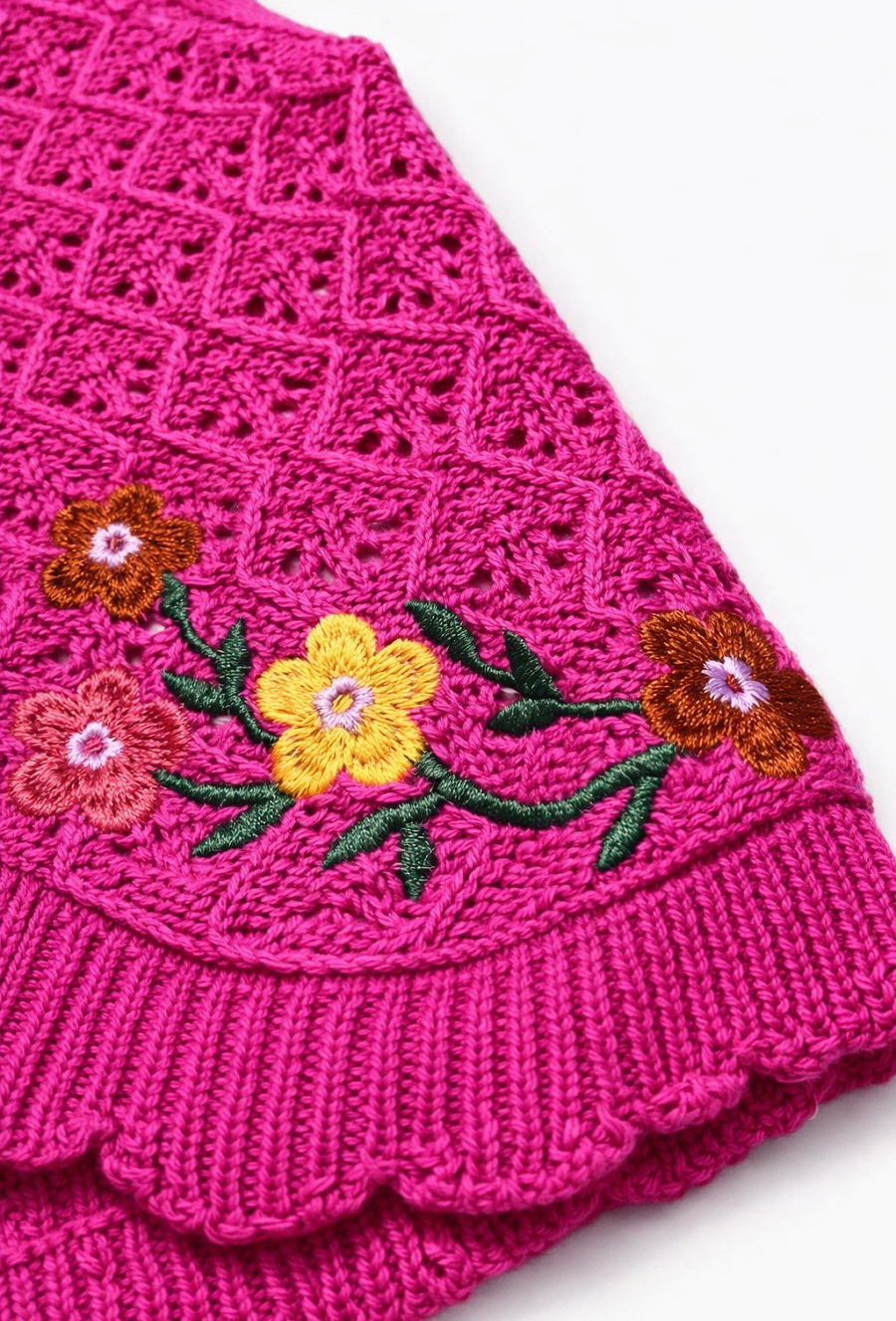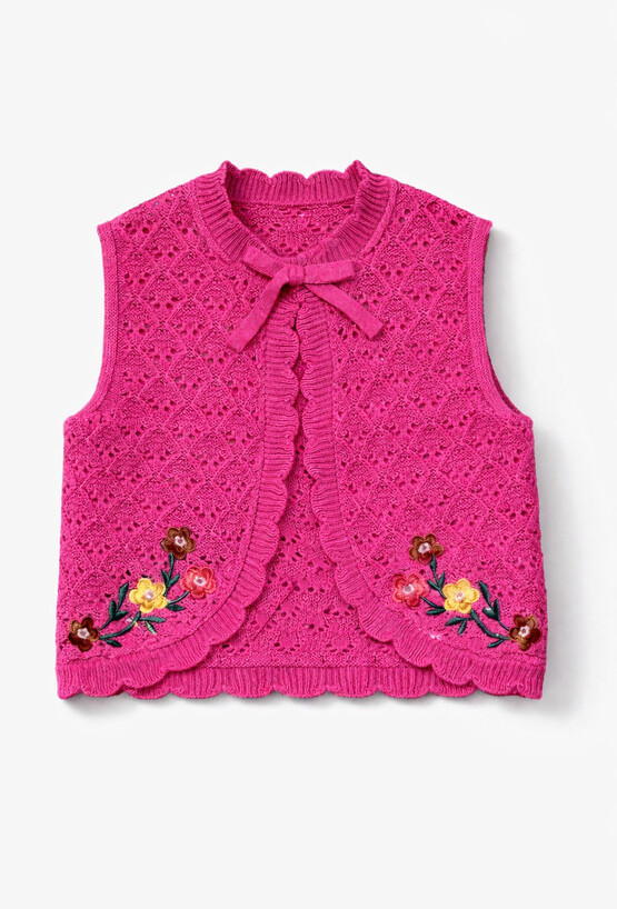 Różowa kamizelka dla dziewczynki z jakości swetrowej, strukturalnej dzianiny to wyjątkowy dodatek do stylizacji na każdą porę roku. Model jest wykonany w 100% z bawełny, dzięki czemu jest przyjemny w dotyku i komfortowy w noszeniu. Wiązanie z przodu nadaje całości uroku, a kwiatowe hafty u dołu pięknie podkreślają dziewczęcy charakter. Kamizelka świetnie wygląda nałożona na T-shirt, bluzkę lub sukienkę.