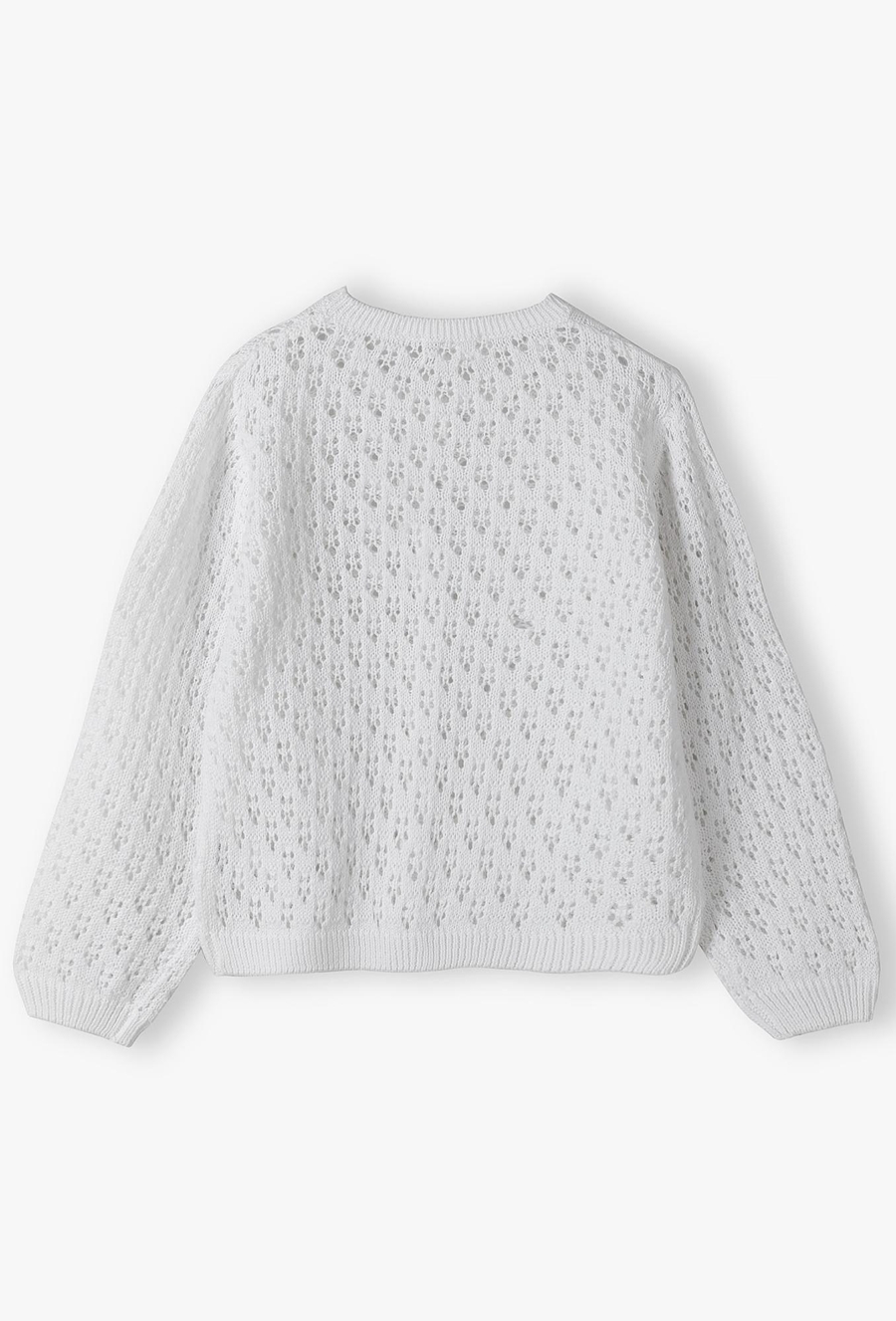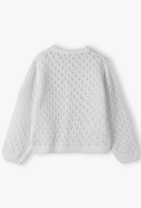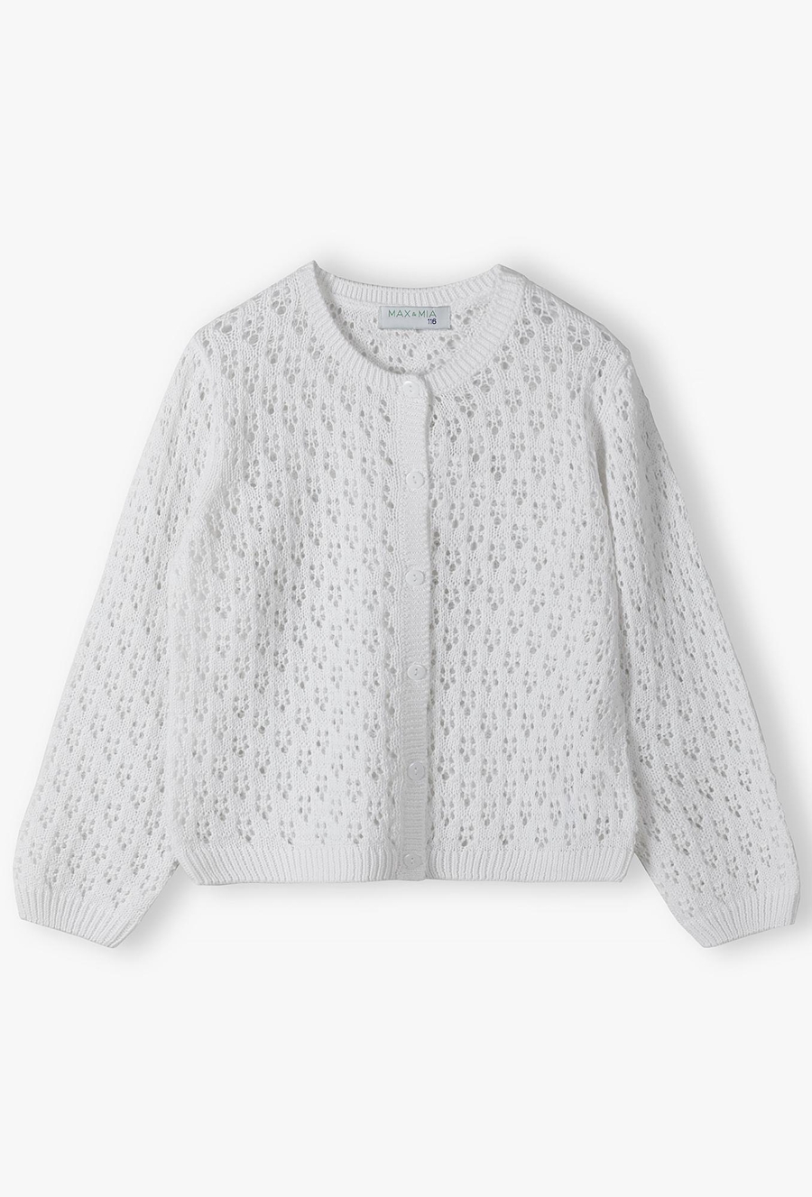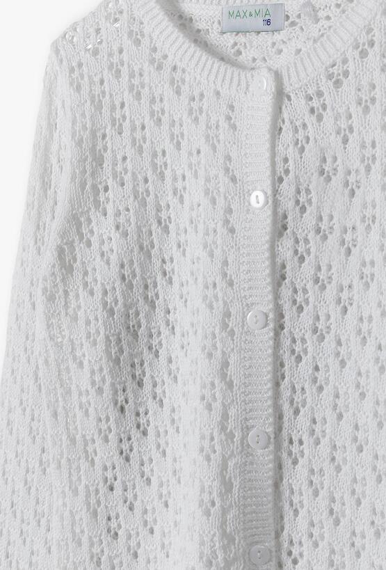 Dopełnij wizytowy strój swojej córeczki z klasą! Ten biały, rozpinany sweter to połączenie subtelnego designu z wyjątkową miękością. Dzięki ażurowej strukturze i starannemu wykończeniu, kardigan ten jest idealnym wyborem na uroczystości rodzinne, święta czy jako elegancka warstwa do letniej sukienki w chłodniejsze wieczory. Cała powierzchnia swetra posiada misterny, dziurkowany wzór, który nadaje mu lekkości i luksusowego charakteru. To detal, który sprawia, że nawet najprostsza stylizacja nabiera wizytowego szyku. Kardigan jest rozpinany na rząd estetycznych, dopasowanych kolorystycznie guzików. Ułatwia to sprawne zakładanie i zdejmowanie.