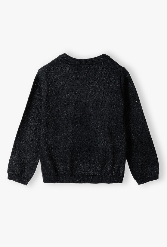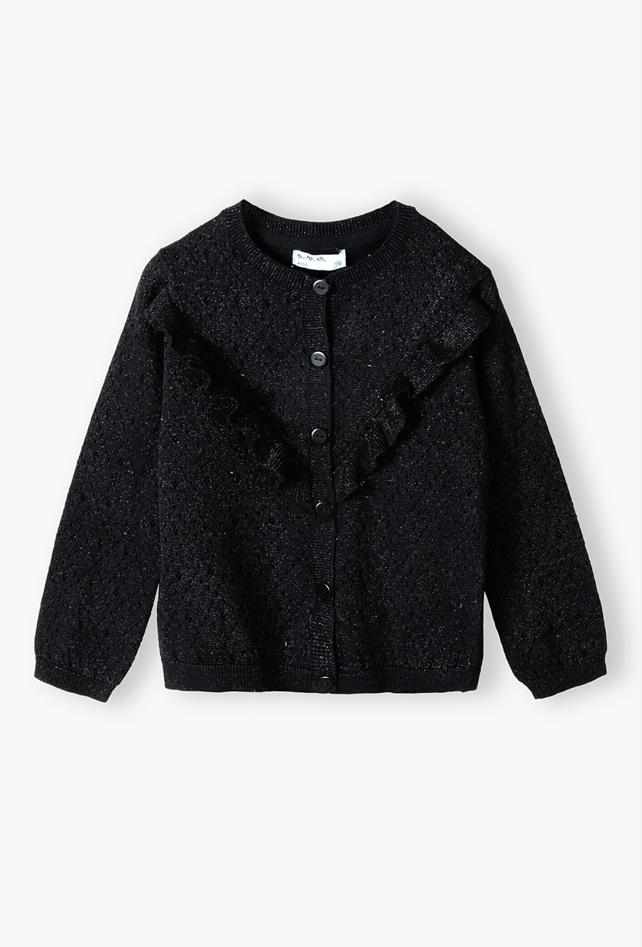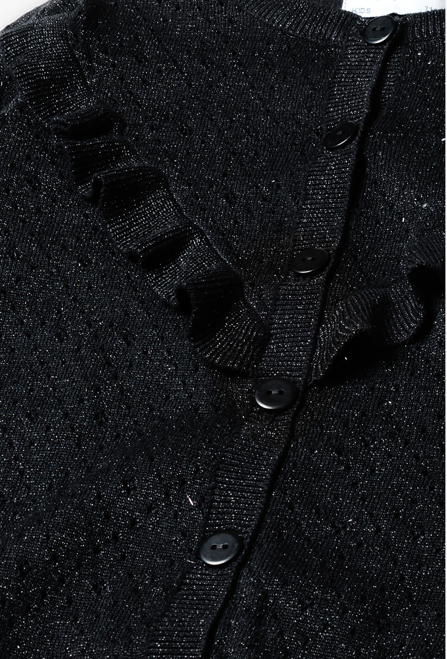 Elegancki czarny kardigan z błyszczącą nitką dla małej dziewczynki. Dodaj blasku stylizacji swojej córeczki dzięki temu wyjątkowemu kardiganowi. To idealne połączenie klasycznej czerni z subtelnym rozświetleniem, które sprawi, że każde wyjście – od rodzinnego obiadu po szkolną uroczystość – nabierze odświętnego charakteru. Kardigan jest zapinany na całej długości na eleganckie, czarne guziki, co ułatwia jego szybkie zakładanie na sukienkę lub bluzkę. Dzianina została wzbogacona o delikatną, połyskującą nitkę, która pięknie mieni się w świetle, nadając sweterkowi luksusowego i nowoczesnego wyglądu. Ten błyszczący sweterek to doskonały wybór dla małej elegantki. Świetnie komponuje się zarówno z tiulowymi spódniczkami, jak i klasycznymi spodniami jeansowymi.